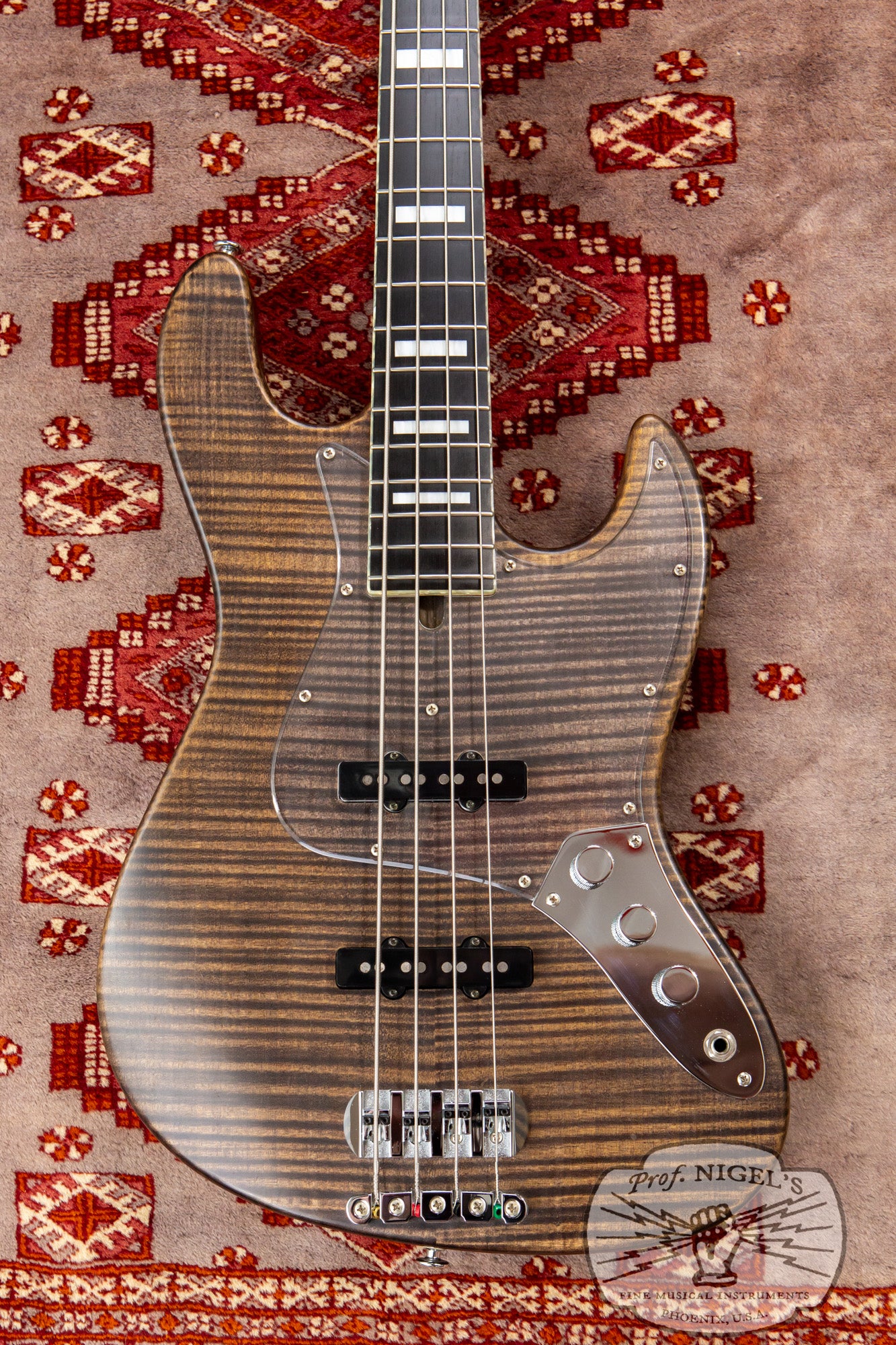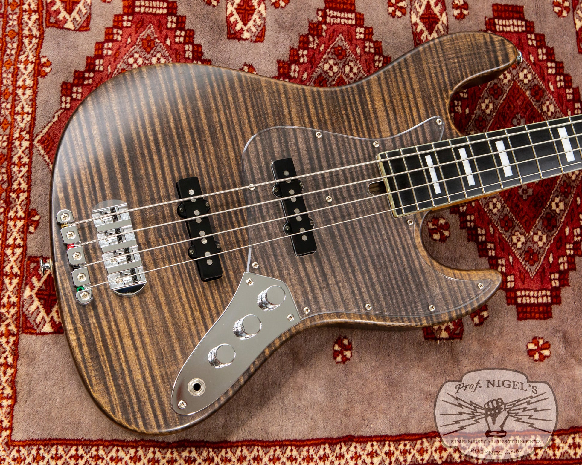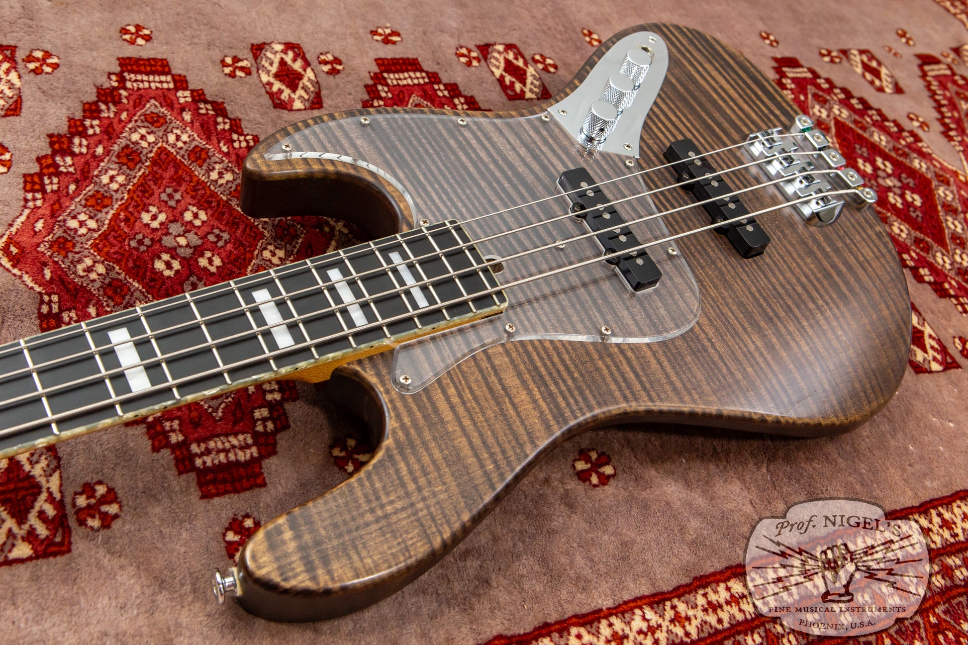 Its body takes inspiration from the classic Jazz Bass silhouette but with slightly more ergonomic contouring and a refined footprint. Constructed with select alder and topped with a beautifully figured flame maple slab, the brown oil finish enhances both the look and resonance of the wood. The pearloid neck binding and block inlays adds to the refined, top-shelf aesthetics.