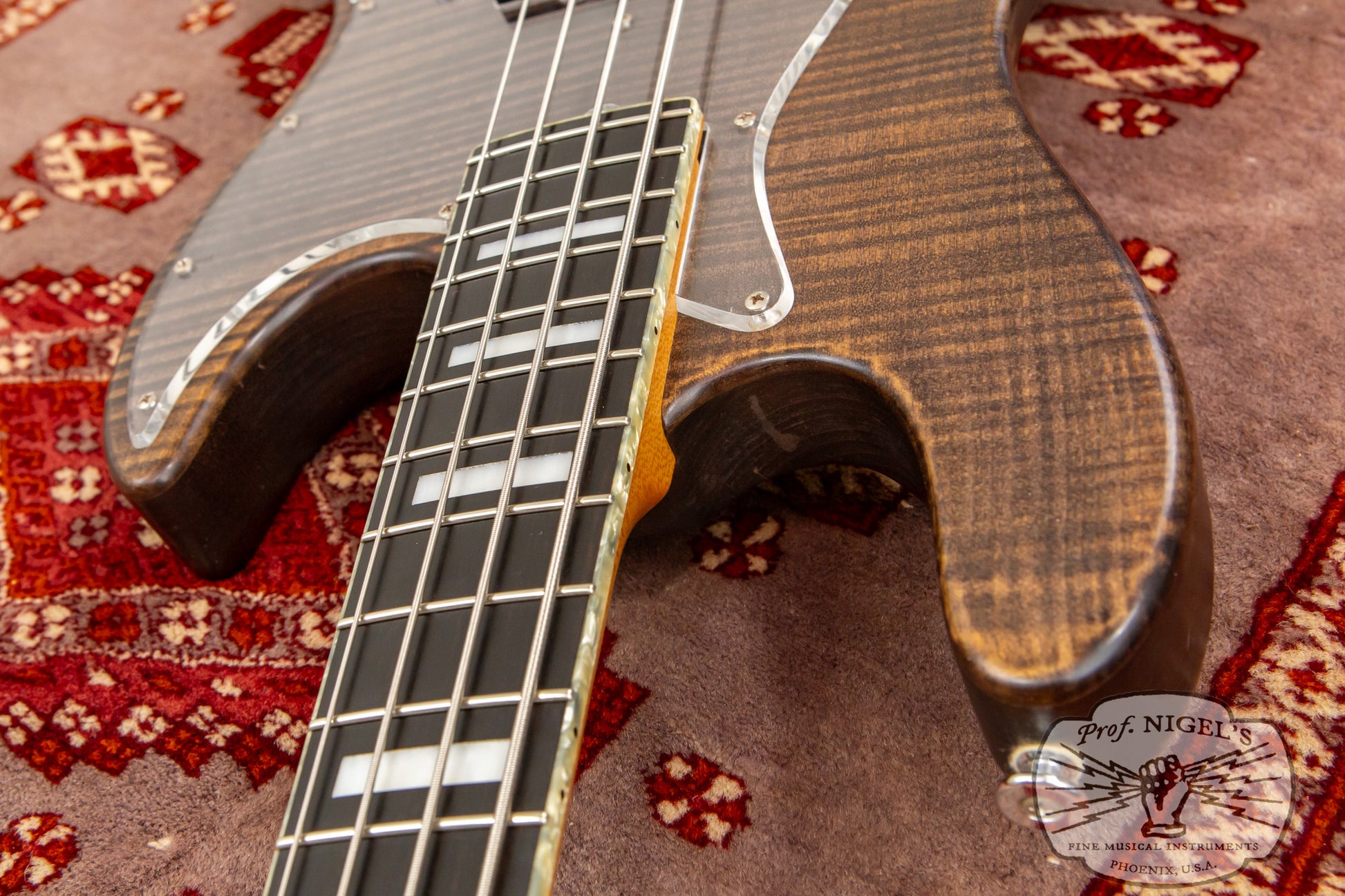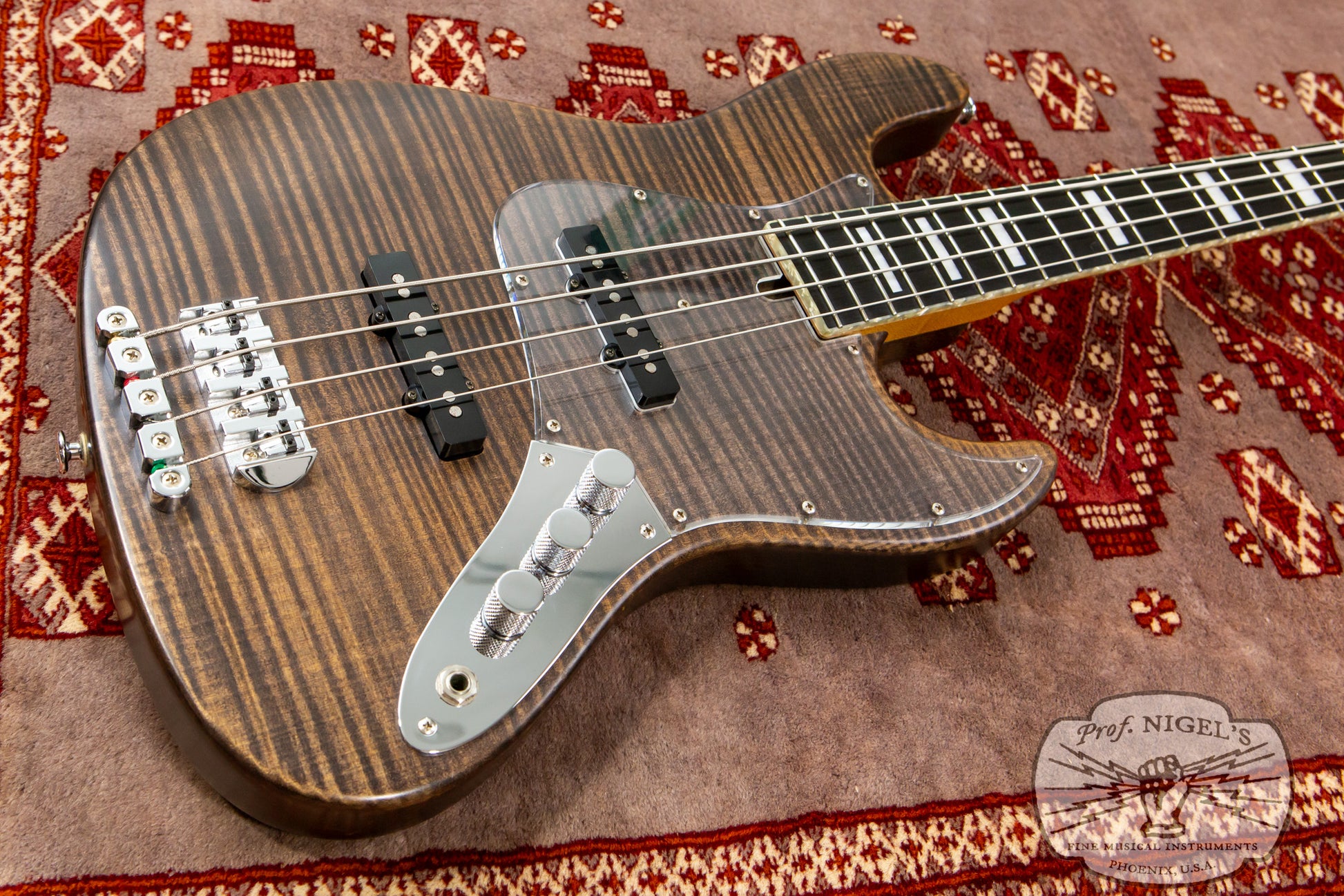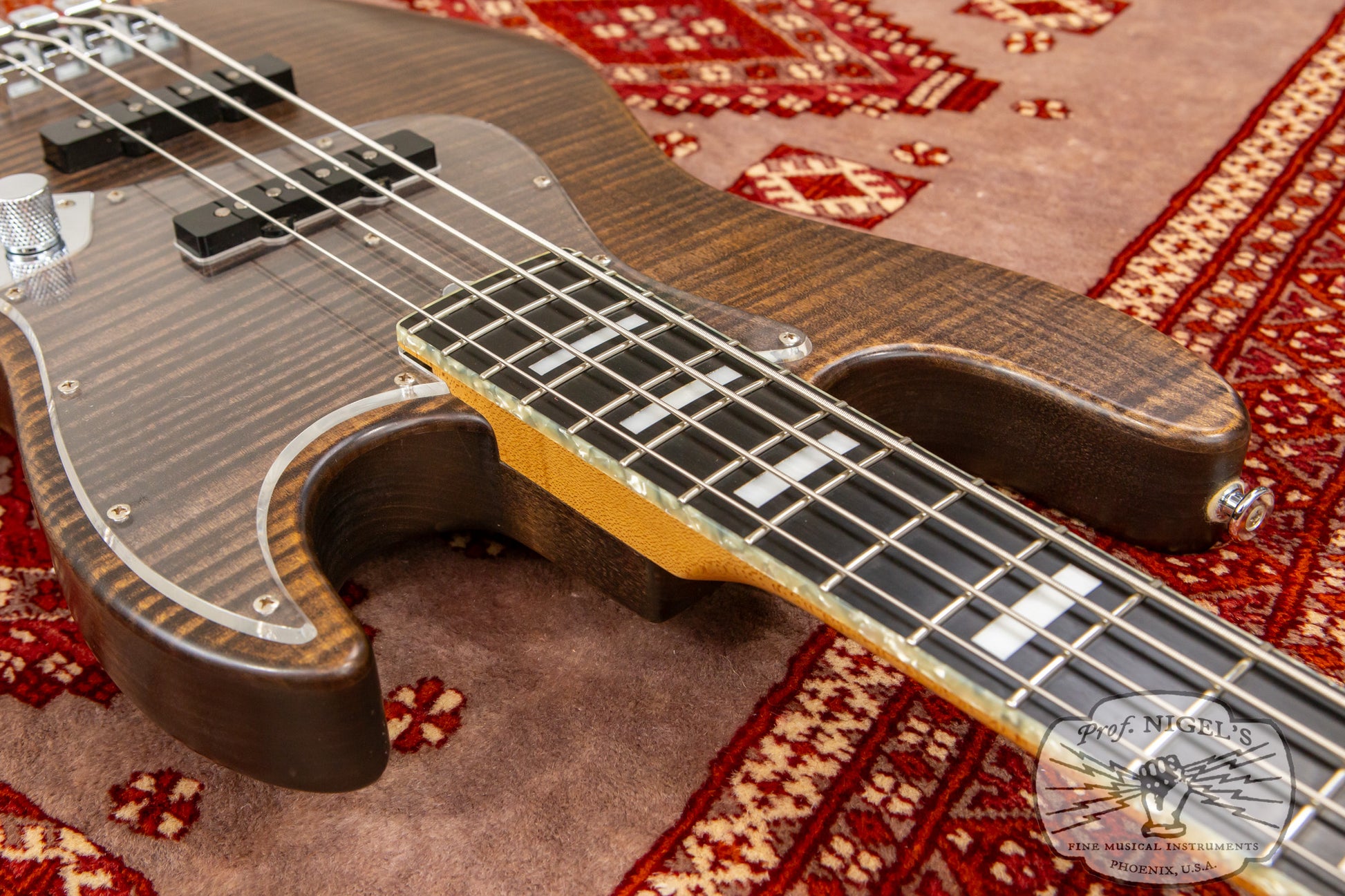 Its body takes inspiration from the classic Jazz Bass silhouette but with slightly more ergonomic contouring and a refined footprint. Constructed with select alder and topped with a beautifully figured flame maple slab, the brown oil finish enhances both the look and resonance of the wood. The pearloid neck binding and block inlays adds to the refined, top-shelf aesthetics.
