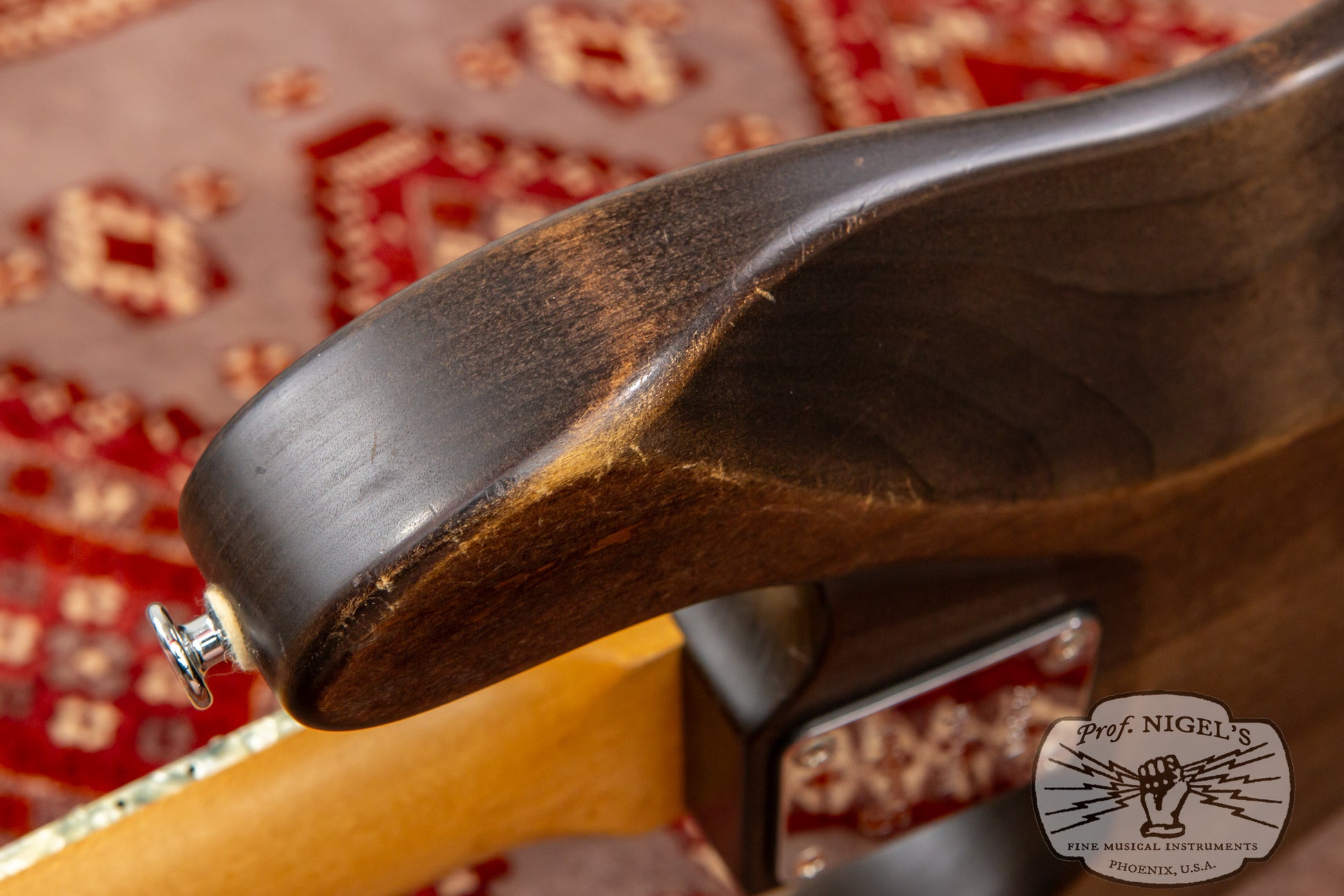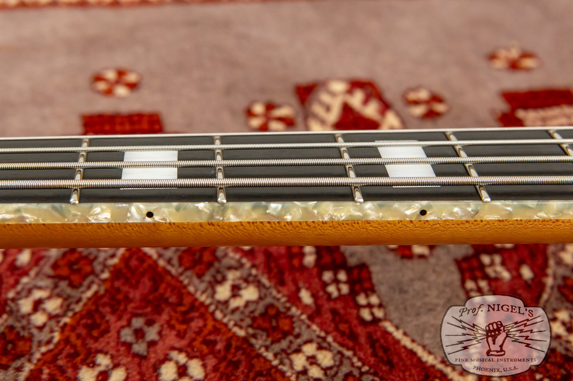 The electronics appear unmodified and function perfectly. The binding, block inlays, and bone nut are all in excellent condition, with the nut height cut precisely and the binding securely in place. The frets have been freshly polished and show only slight wear. The neck is arrow-straight with no signs of warping, and the truss rod adjusts cleanly in both directions.