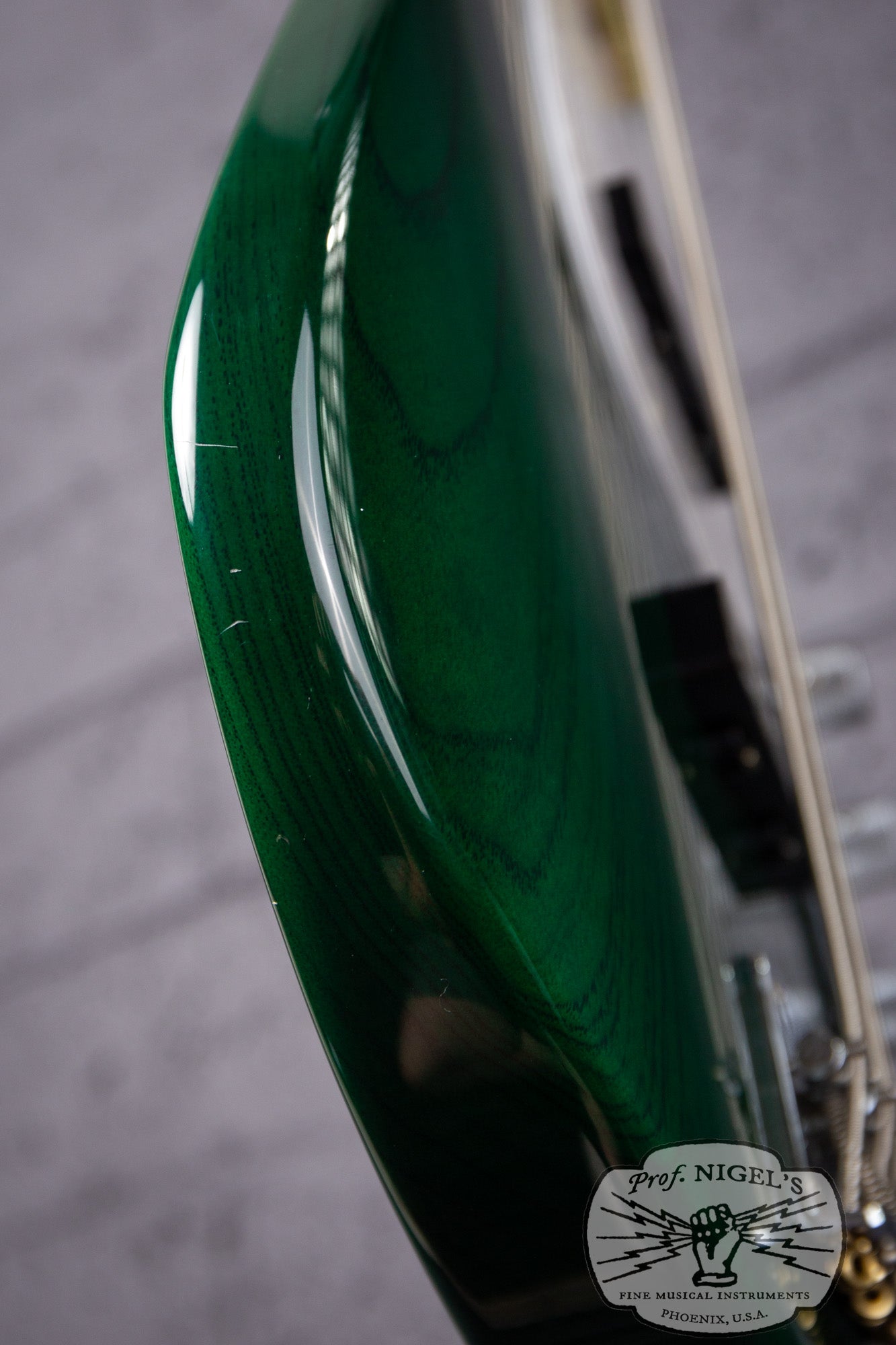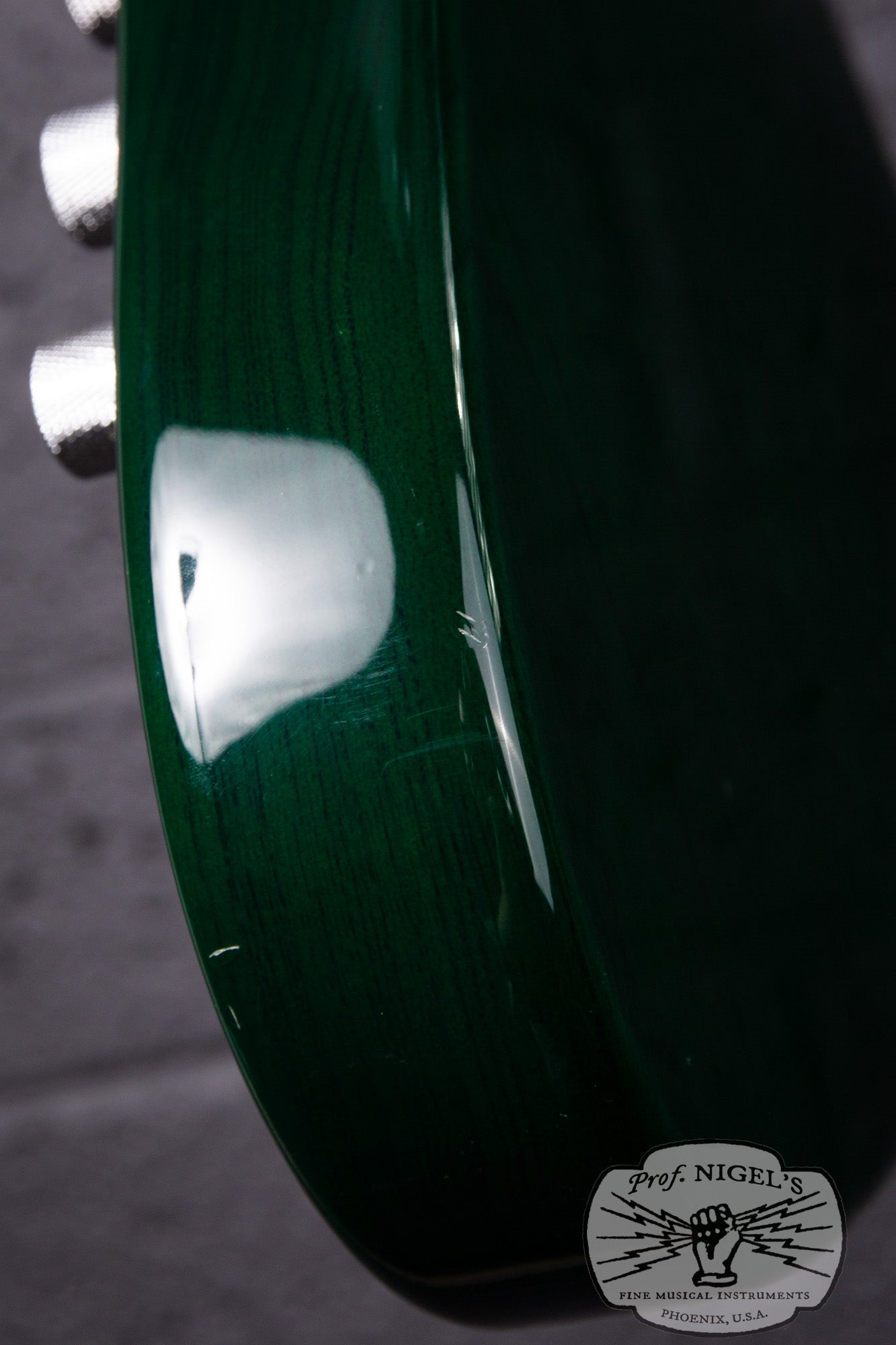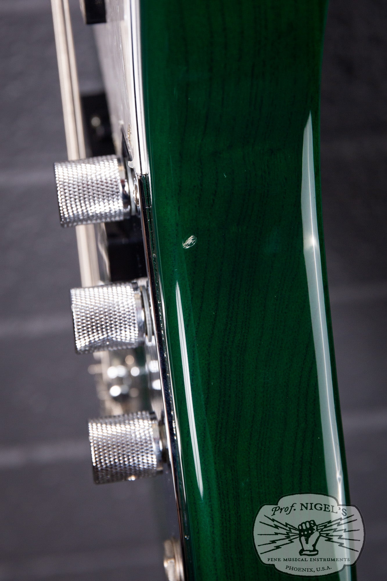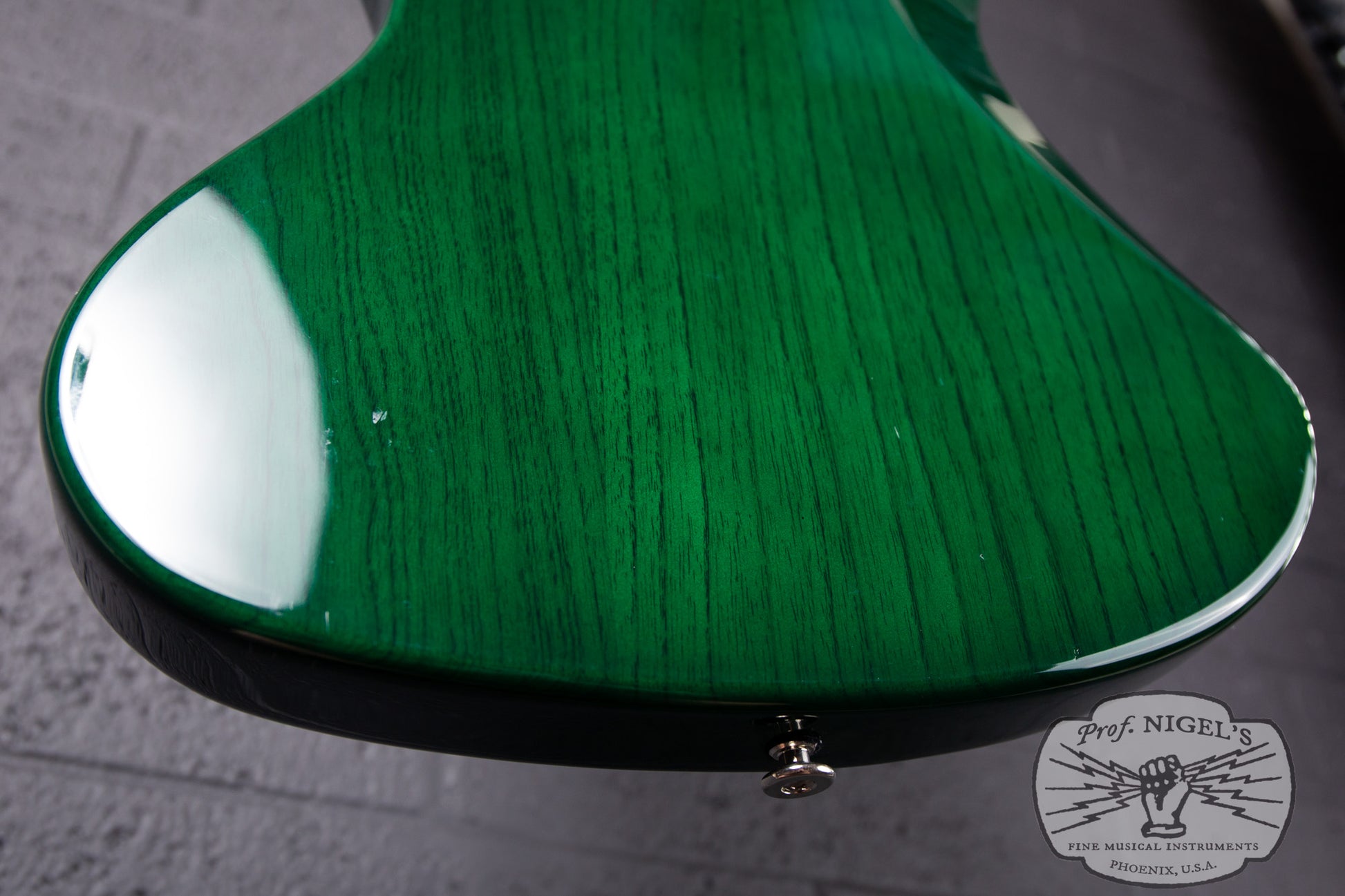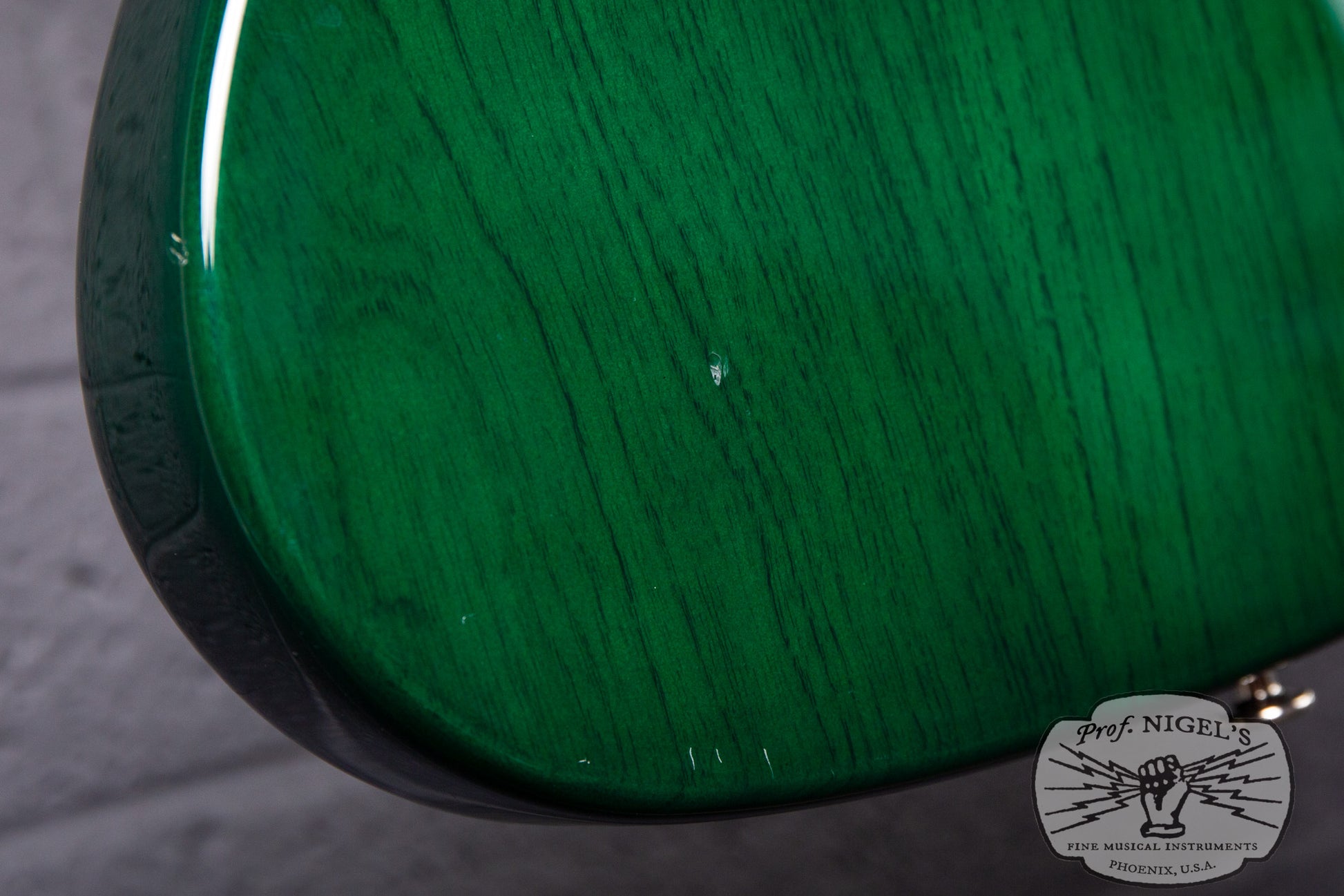 This bass is in Excellent condition with minimal signs of use that don’t affect playability. There are shallow dents and scratches primarily near the back and perimeter of the lower bout (pictured). There is a shallow ding along the perimeter near the control cavity (pictured). Minor patina is visible on the metal parts such as bridge and tuning keys. The electronics remain original with no issues. The neck binding, block inlays, frets, and nut are all in excellent shape, with the binding secure and frets showing only slight wear. The neck is straight, and the truss rod adjusts smoothly in both directions. We replaced the crumbling original pickup foam to ensure proper pickup height and adjustability.