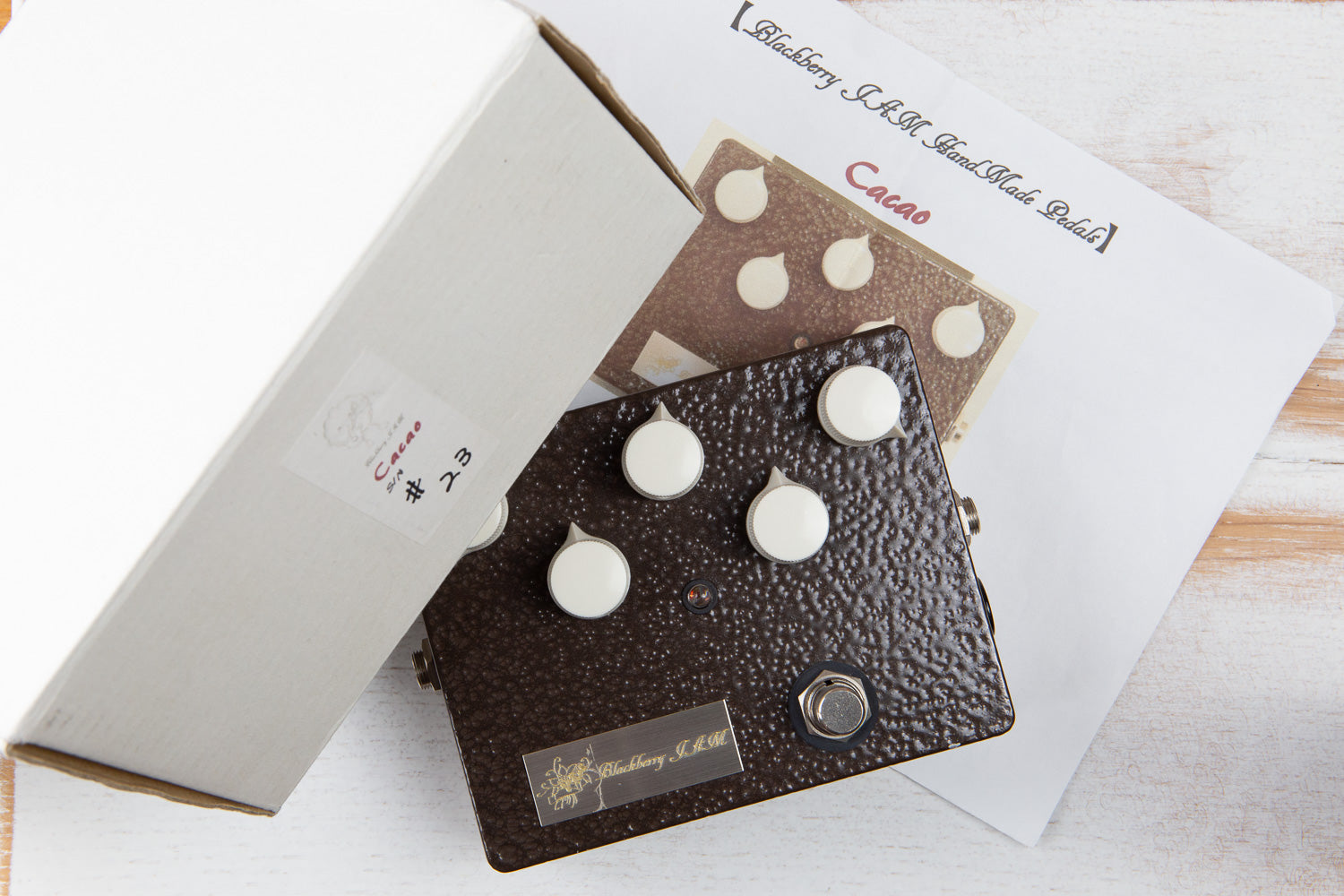 The Cacao is a boutique handmade preamp and overdrive pedal carefully designed to have the feel and sound of a Marshall 1987 tube amp. Production of this pedal has ended, and it is becoming difficult to find in Japan and very rare to find outside of Japan.
