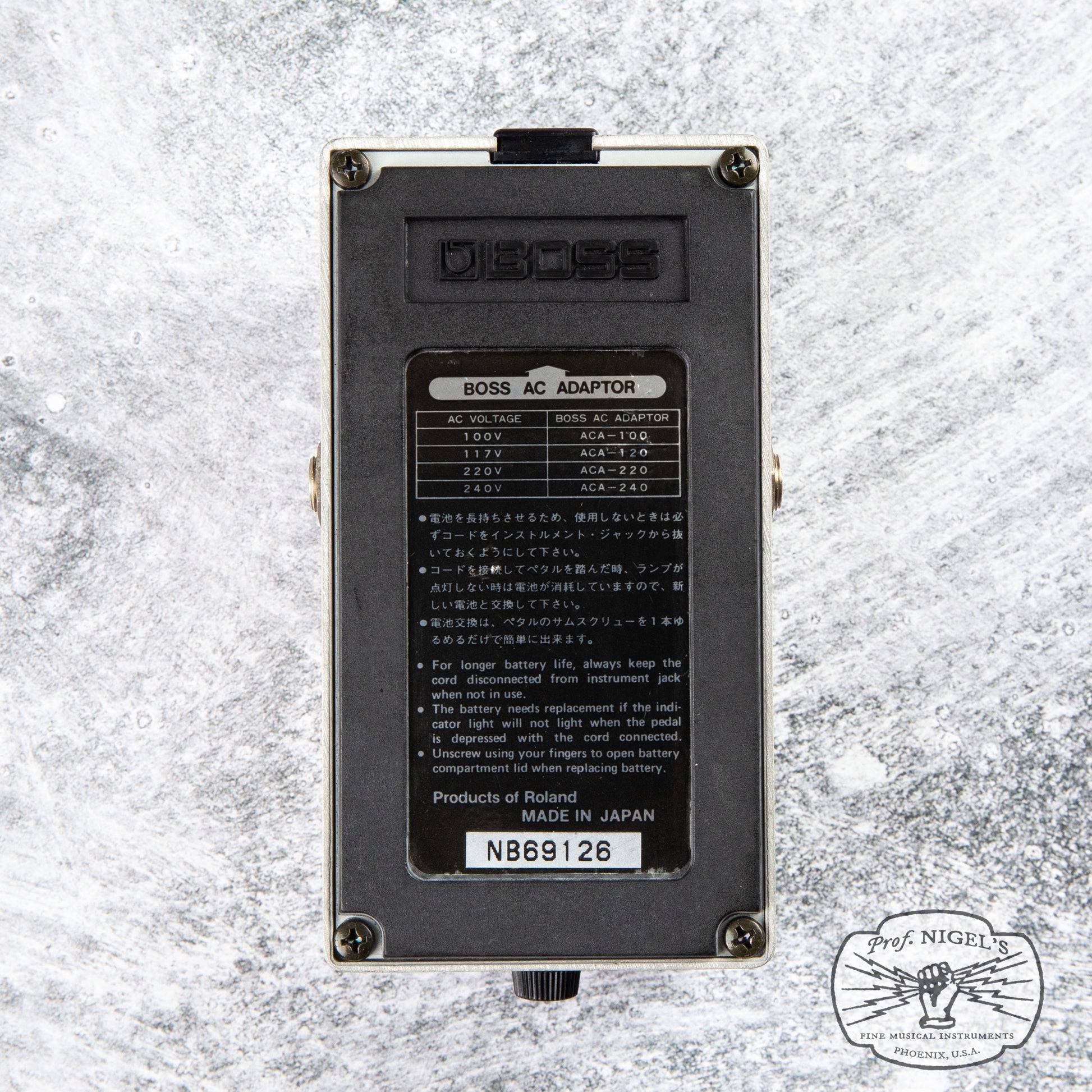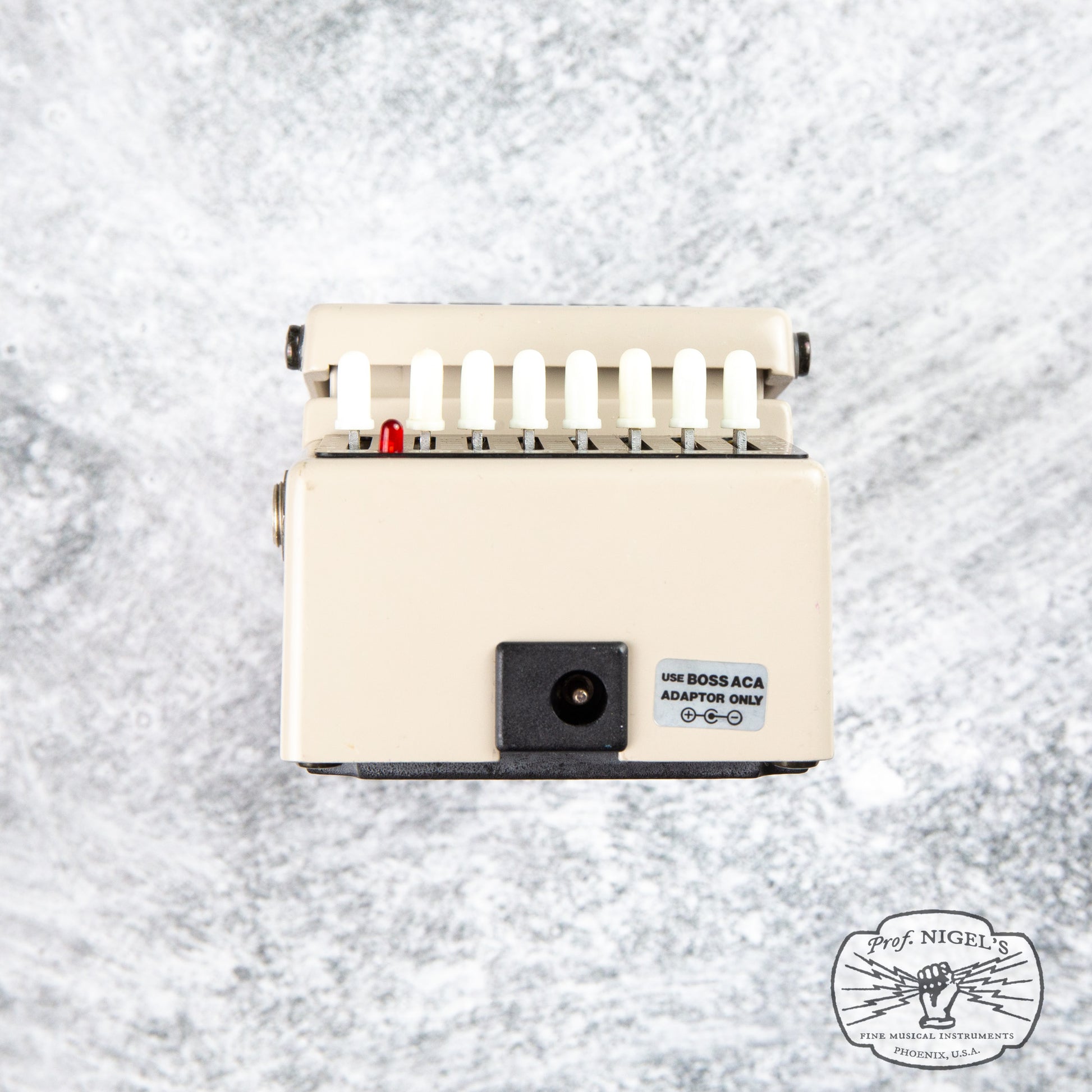 This effect pedal is in Excellent condition. There are minor scattered chips and scuffs on the exterior. This unit has been thoroughly cleaned and tested with 9v battery and ACA compatible power supply. We replaced the original deteriorating rubber screw grommet. All functions are operational. Build date of July 1990. The original box and instructions are not included. This unit requires a BOSS ACA compatible power supply or a 9V battery. Unsure about powering Boss ACA 12v pedals? Send us a message.