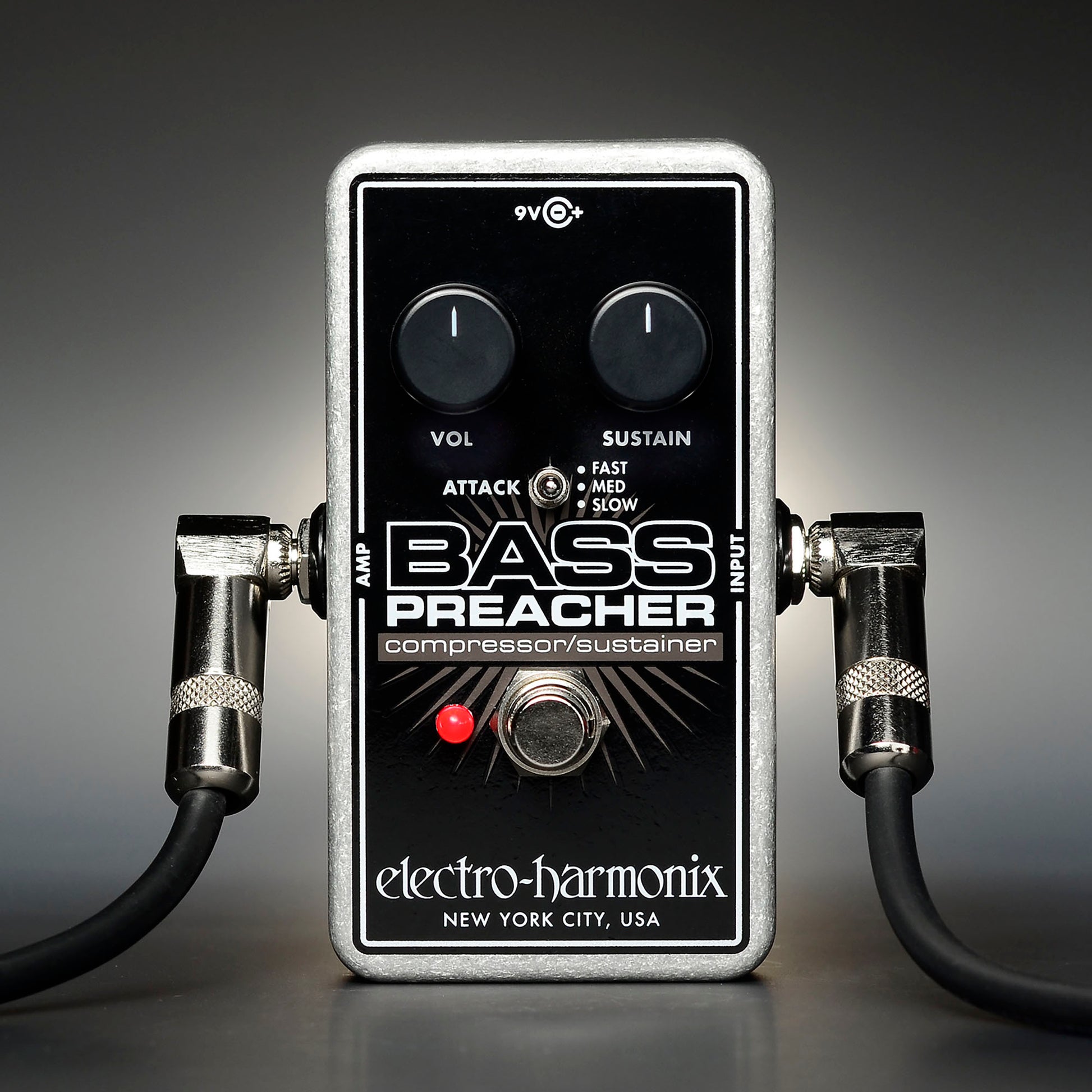 The Electro-Harmonix Bass Preacher is a compressor/sustainer built specifically to handle the wide dynamic range and deep frequencies of the bass guitar. Its input sensitivity spans from -10 dBu to +2 dBu, making it suitable for both passive and active basses.