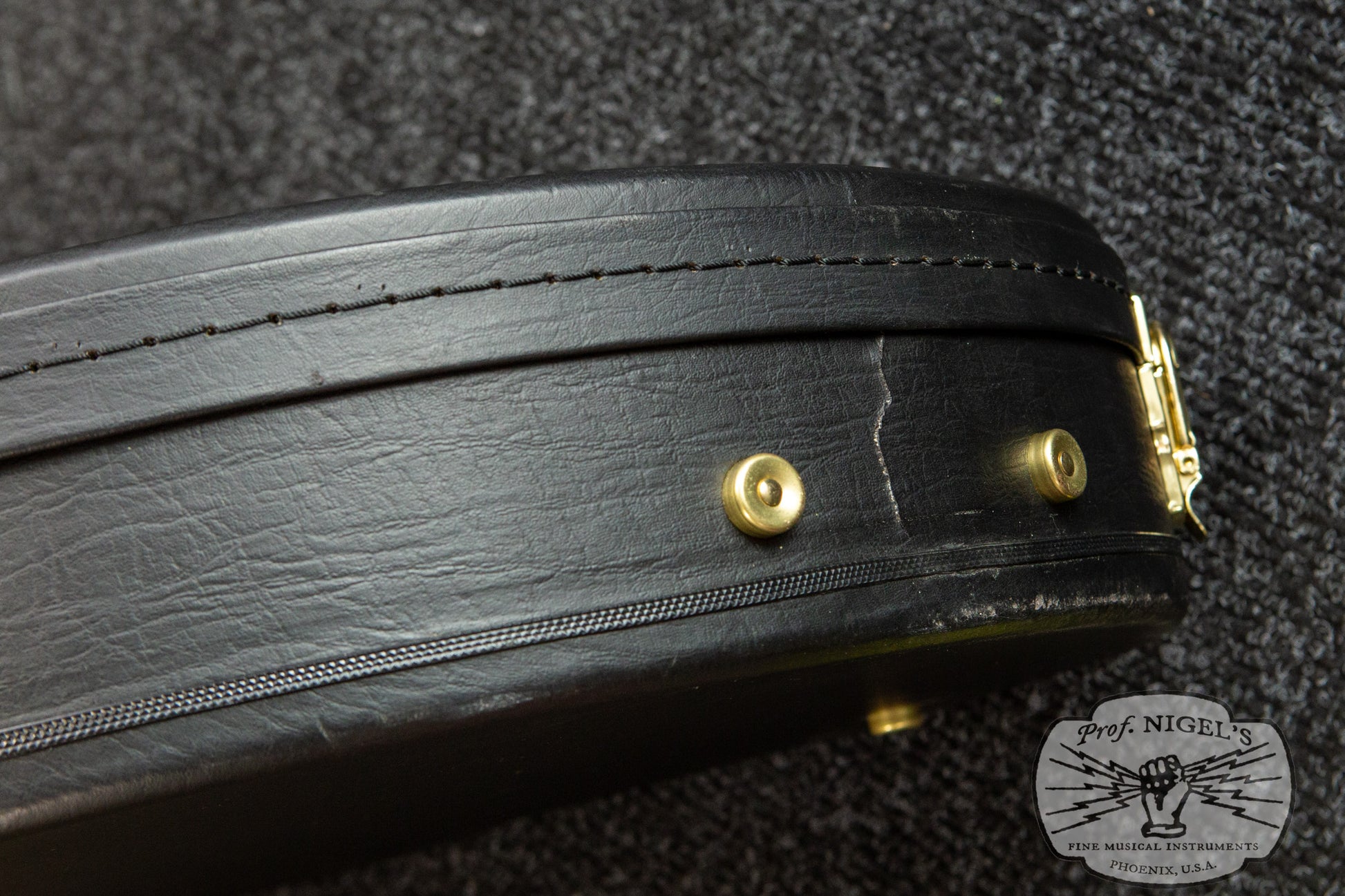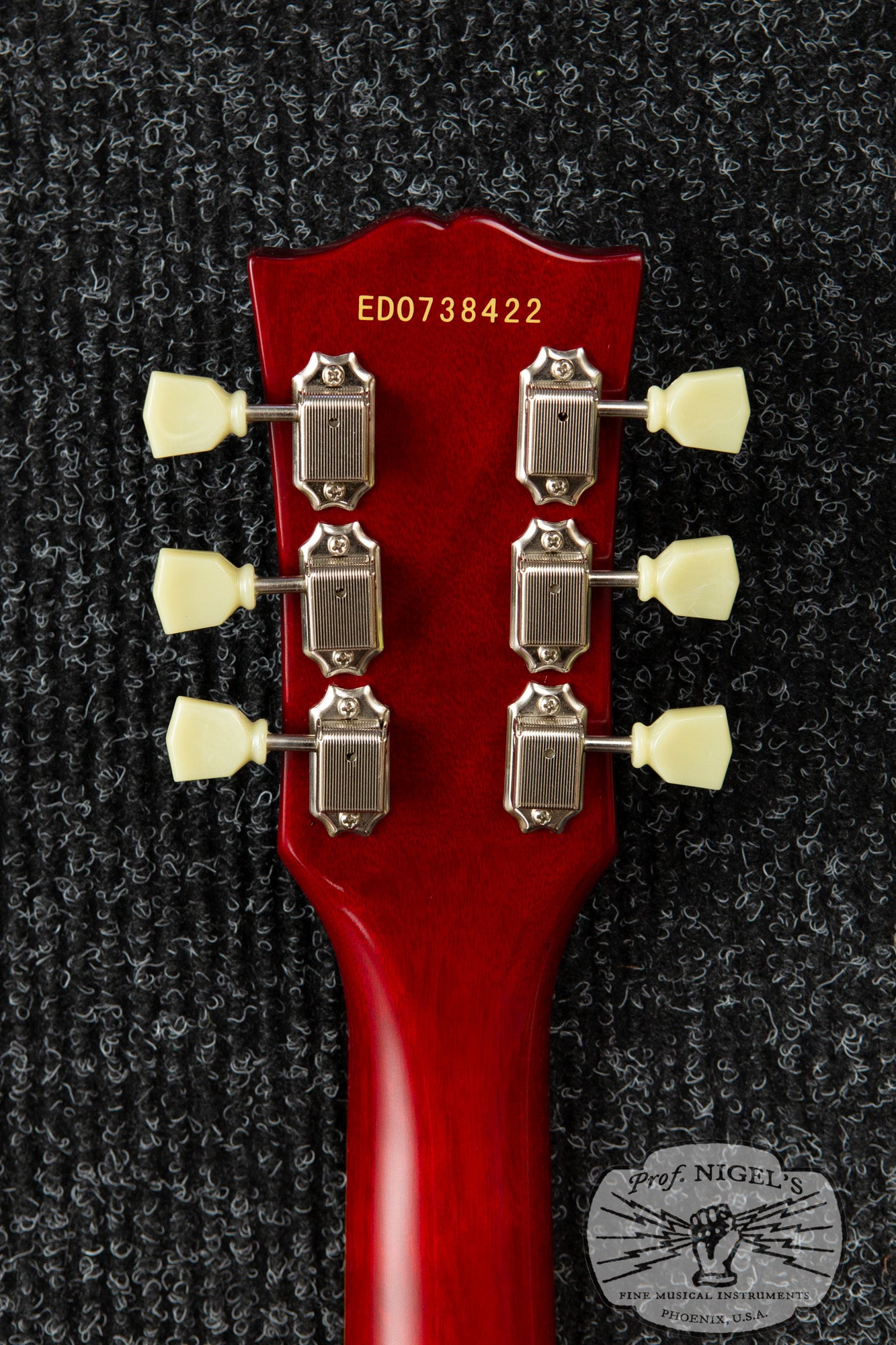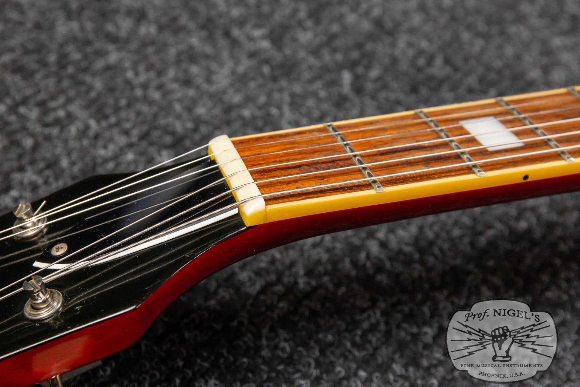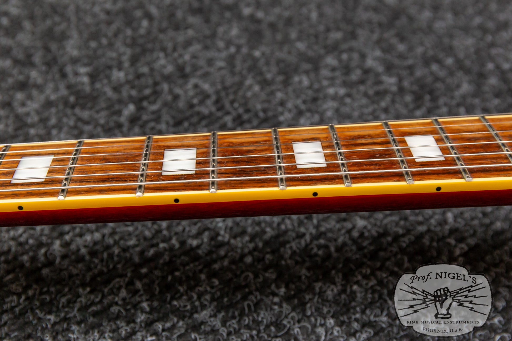 The masterfully shaped C-profile one-piece mahogany neck feels amazing in hand. The width, depth and profile of this neck are best described as “medium” (measurements above), with just enough depth and shoulder to feel substantial without feeling overly thick or cumbersome. In practice, it feels fast, fluid and comfortable. Handsomely figured cinnamon-toned rosewood is used for the fingerboard, which sports expertly finished medium frets, bone nut, and white pearloid block inlays. The vintage crème binding lining the body is seamless, showing no gaps or areas pulling away with age. Vintage 3+3 Kluson-style locking tuners are used, providing a nice modern touch, easy restringing, and stable tuning.
