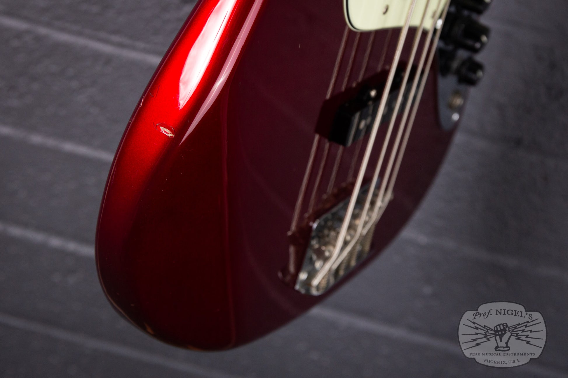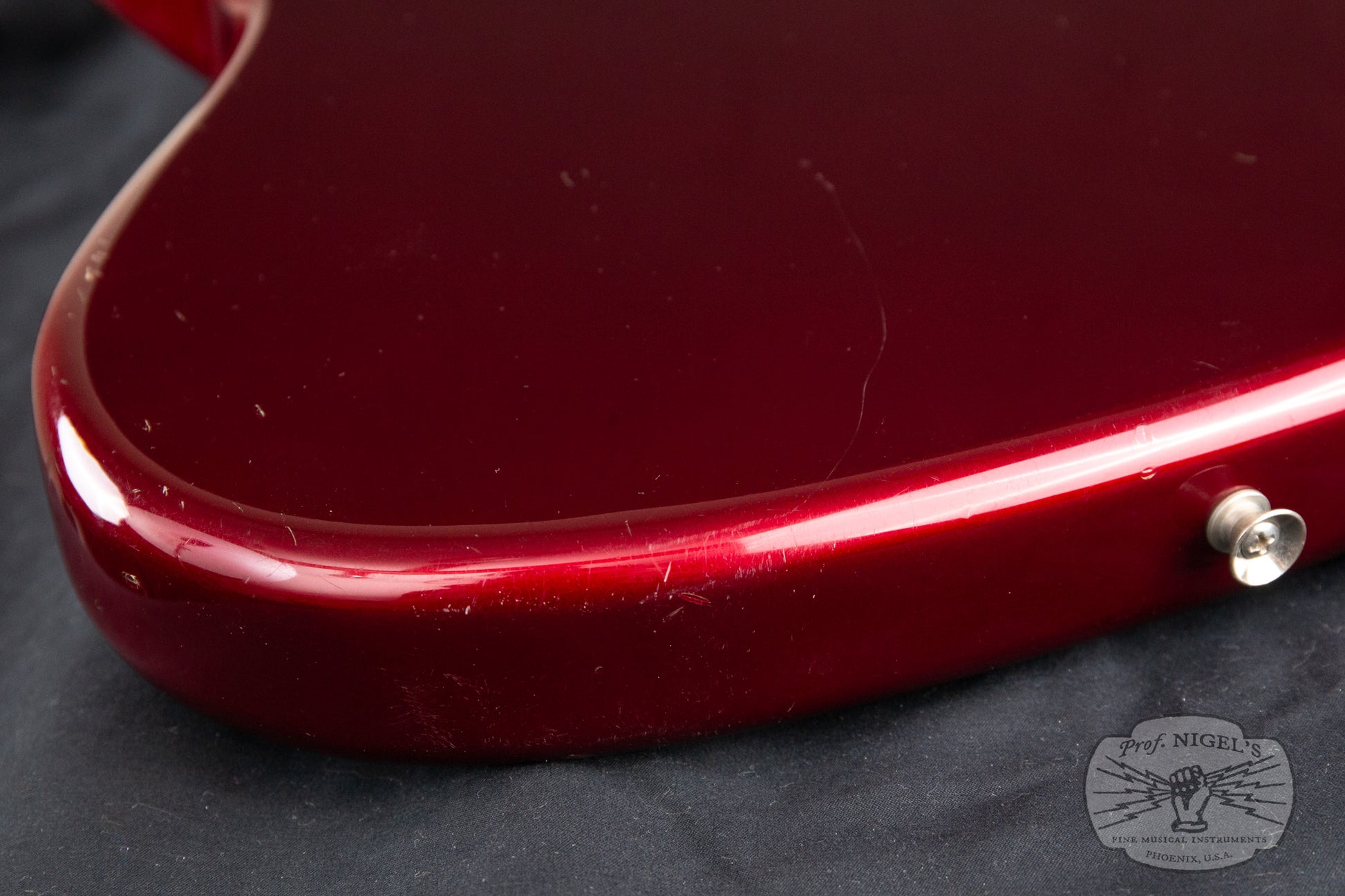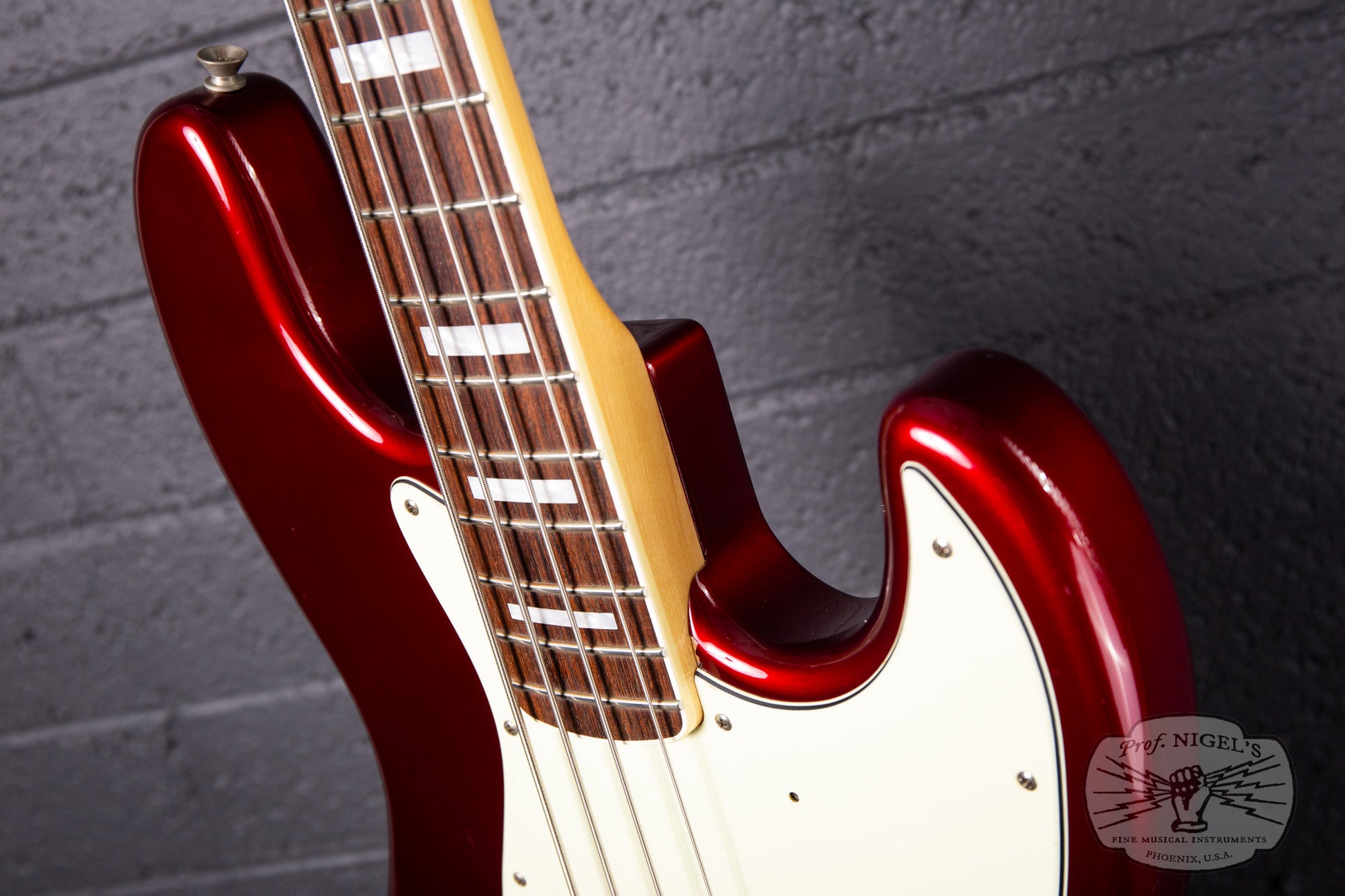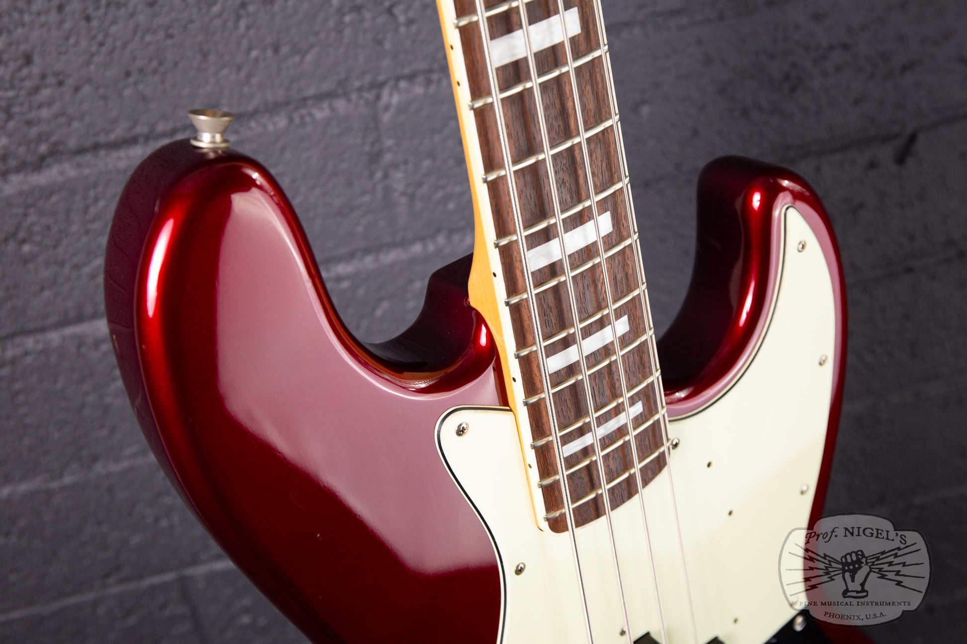 Swathed in old Candy Apple Red paint, this bass exudes class and mystique. Depending on the angle and intensity of light, the metallic finish shifts from deep red tones to almost black. The vintage spec 7.25-inch radius maple neck is topped by a beautifully figured chocolate colored rosewood fretboard with masterfully applied creme binding and while pearloid block inlays. A head-side bullet type truss rod nut and large trapezoidal tuning peg plates round out the period appropriate appointments. Beautifully crafted, the maple neck is shaped in a comfortable, easy playing U-profile (measurements above). The gloss finish on the neck is smooth and flawless. The fretwork is outstanding and lower action is possible if that is your preference.