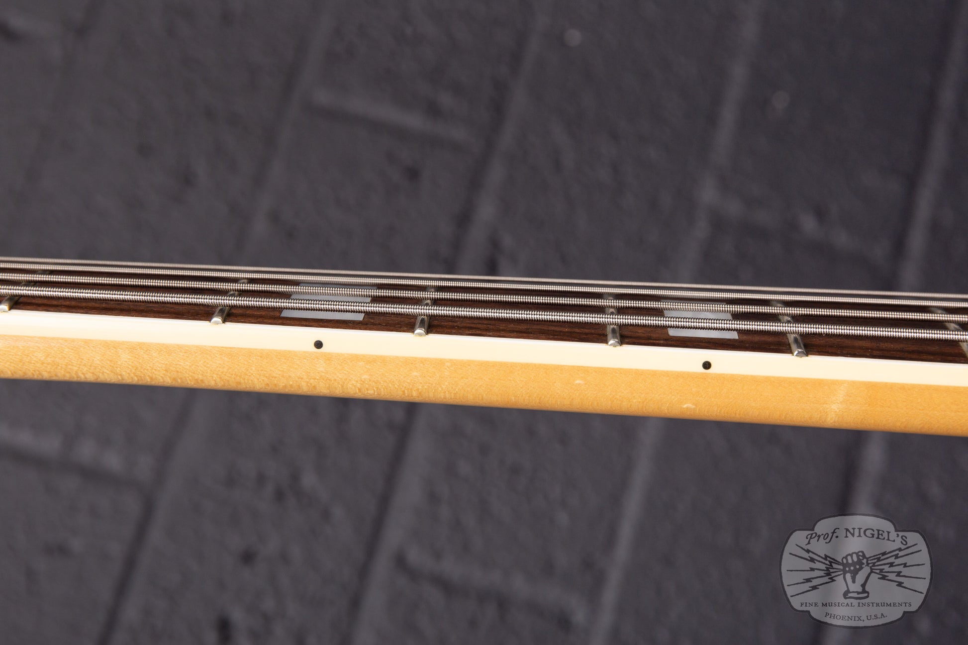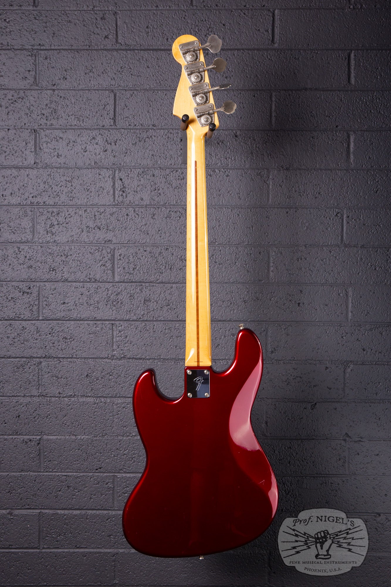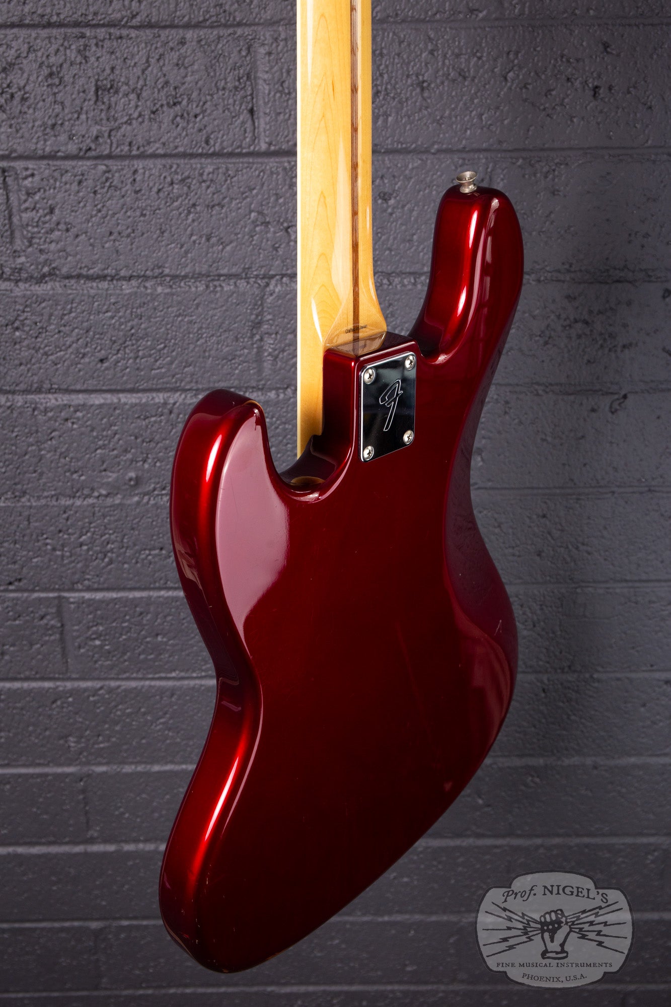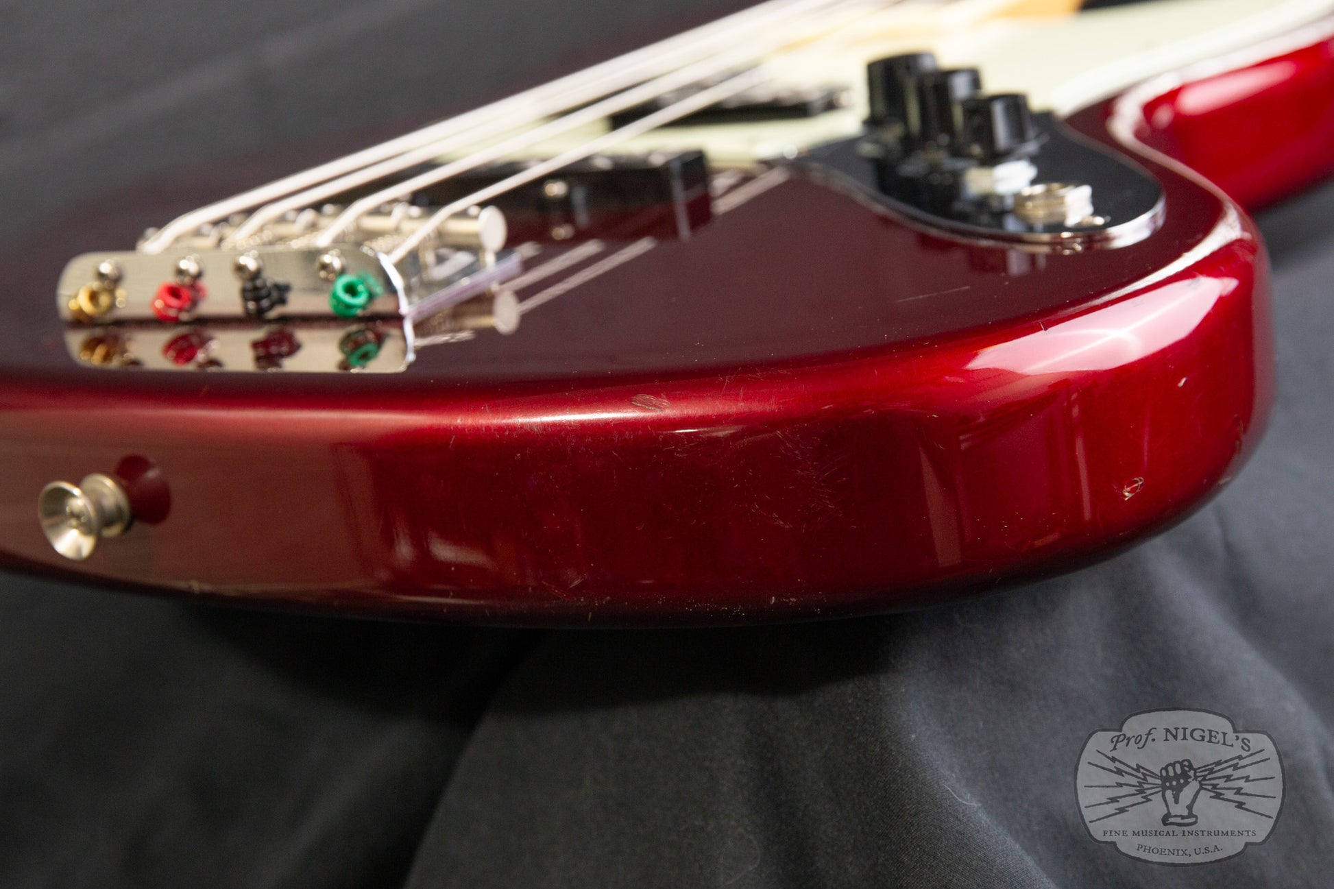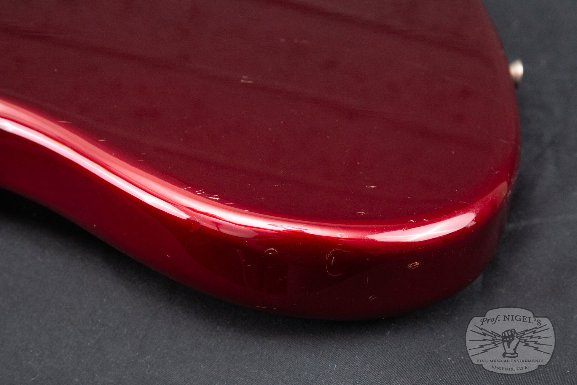 Swathed in old Candy Apple Red paint, this bass exudes class and mystique. Depending on the angle and intensity of light, the metallic finish shifts from deep red tones to almost black. The vintage spec 7.25-inch radius maple neck is topped by a beautifully figured chocolate colored rosewood fretboard with masterfully applied creme binding and while pearloid block inlays. A head-side bullet type truss rod nut and large trapezoidal tuning peg plates round out the period appropriate appointments. Beautifully crafted, the maple neck is shaped in a comfortable, easy playing U-profile (measurements above). The gloss finish on the neck is smooth and flawless. The fretwork is outstanding and lower action is possible if that is your preference.