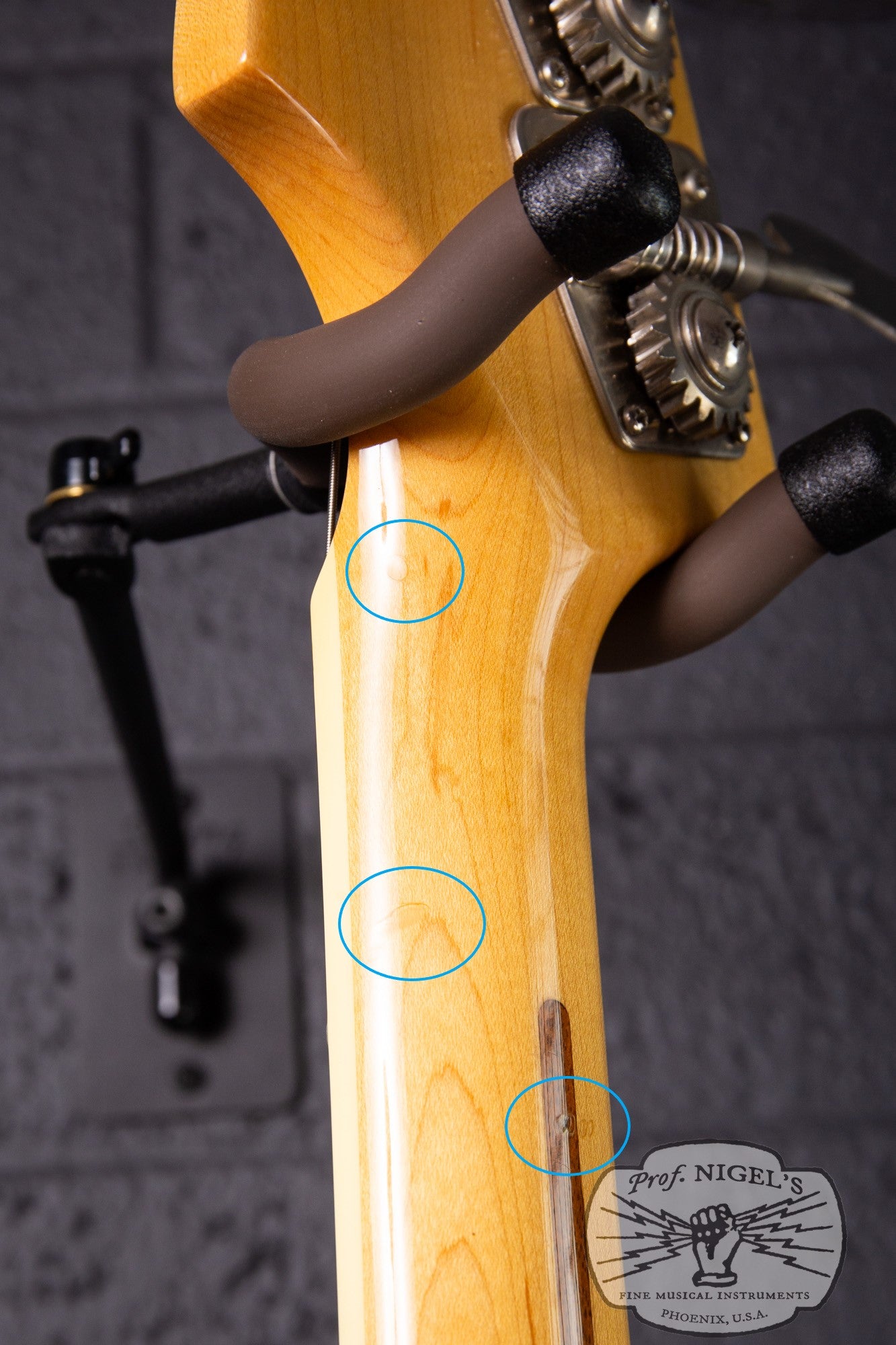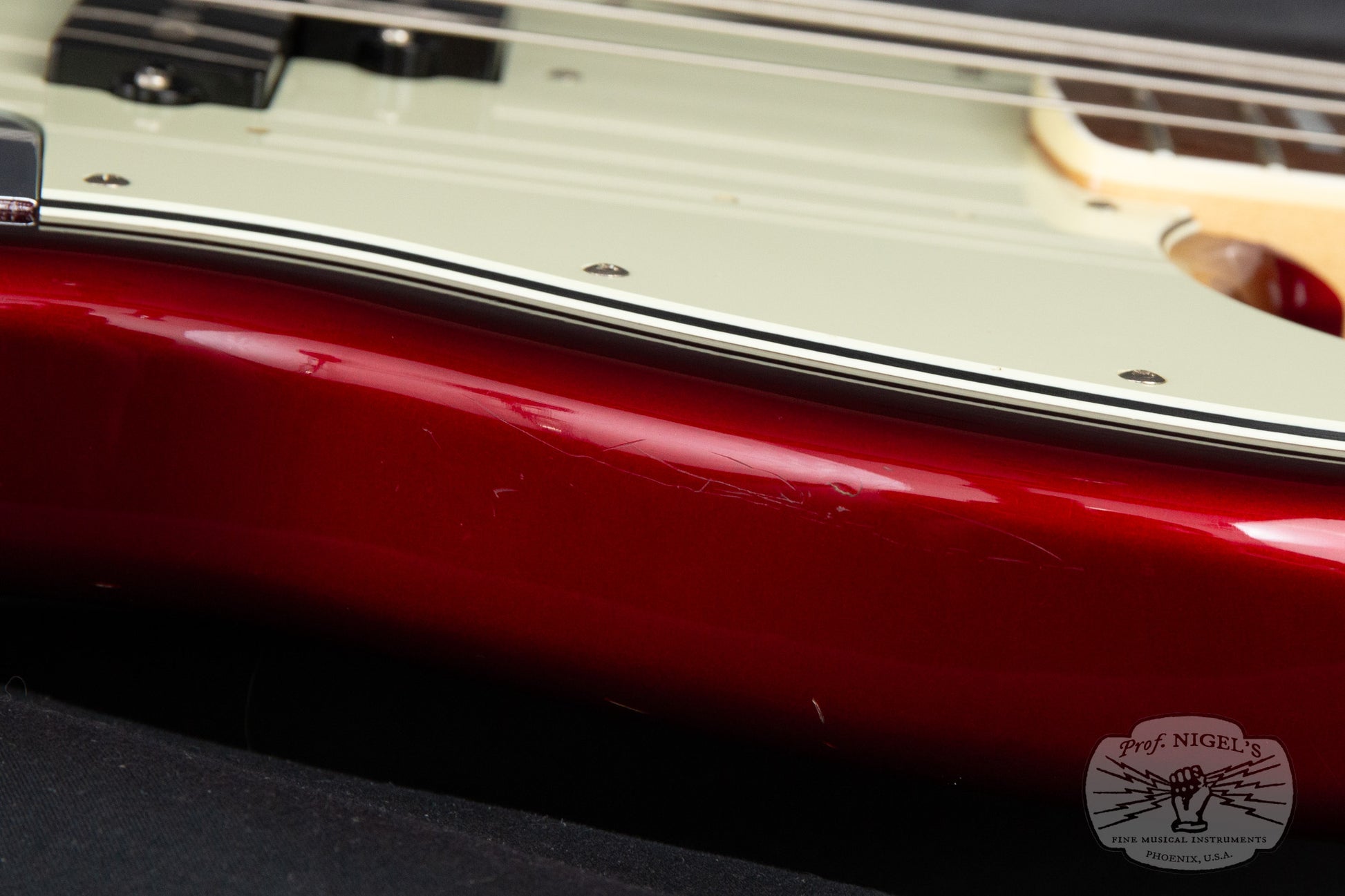 This bass is in Very Good condition and is a solid player grade instrument with no issues interfering with playability or functionality. There are scattered scratches and chips across the surface of the body, primarily on the back and edge of the lower bout. The most notable dents, scrapes and chips around the perimeter of the lower bout are pictured, however this paint color does a very good job of hiding imperfections in normal lighting. There are a couple very shallow dents on the back of the neck behind the nut and 1st fret that do not interfere with playing comfort. There is a small paint chip on the lower side of the neck pocket. The frets show minor signs of wear (no significant wear spots) and have plenty of life remaining with no buzzing or dead frets. The truss rod is in good working order with adjustability in both directions. The neck is straight with no signs of warping or waviness. The tuners and control cavity cover have developed a very pleasing mild patina. There are no areas of separation in the neck binding and the gloss finish on the neck is perfectly smooth. The electronics are in perfect working order with no modifications.