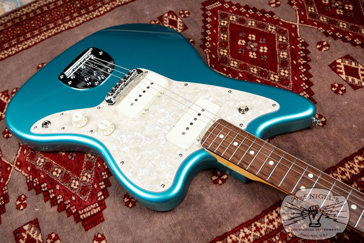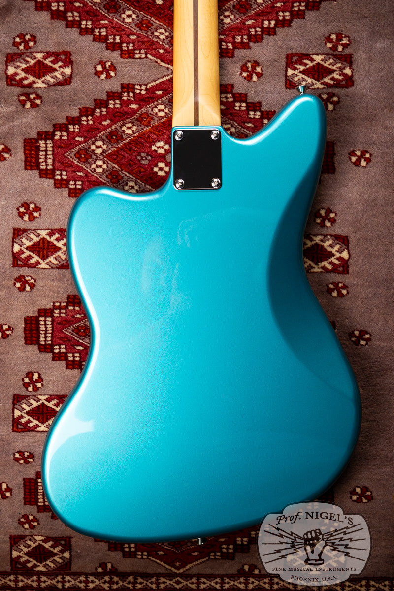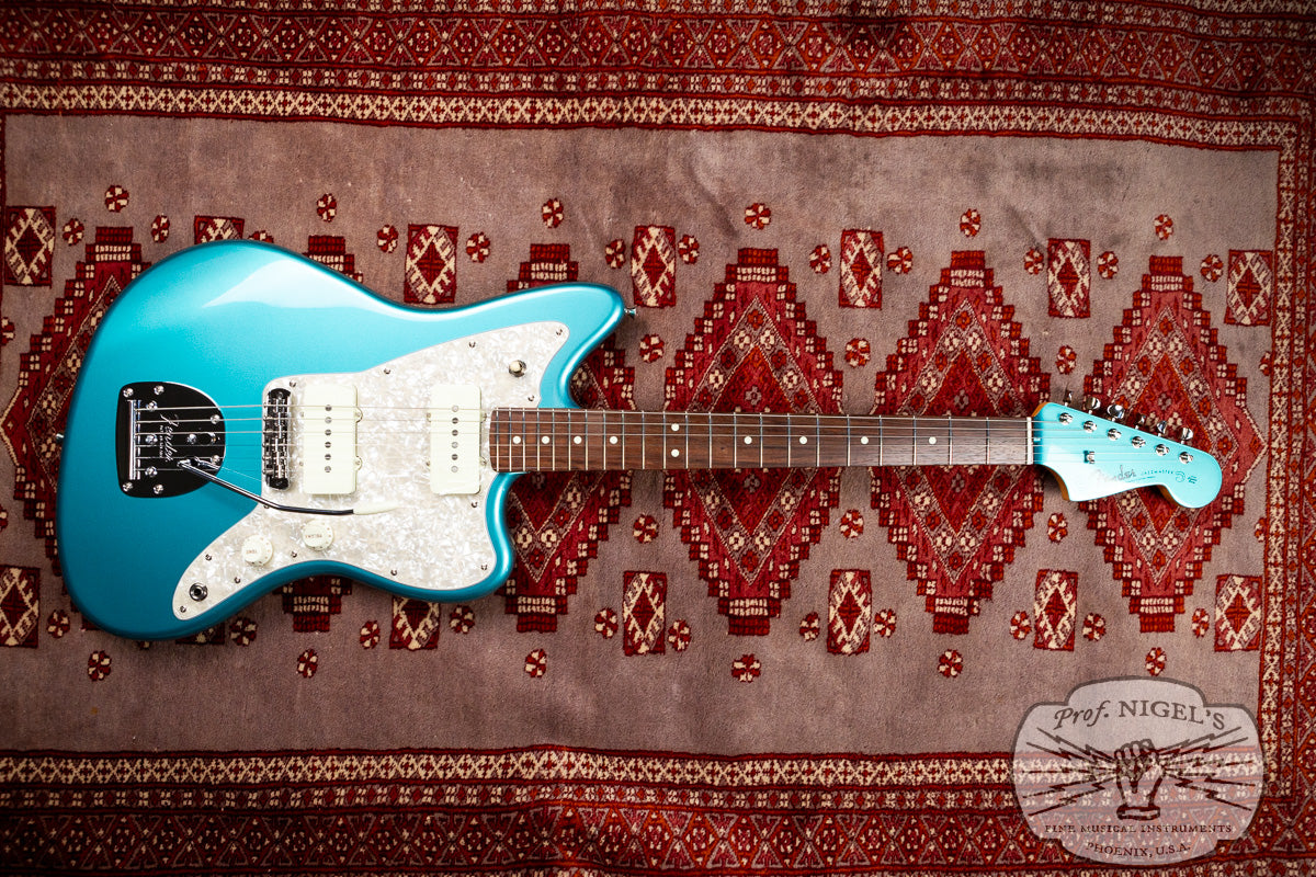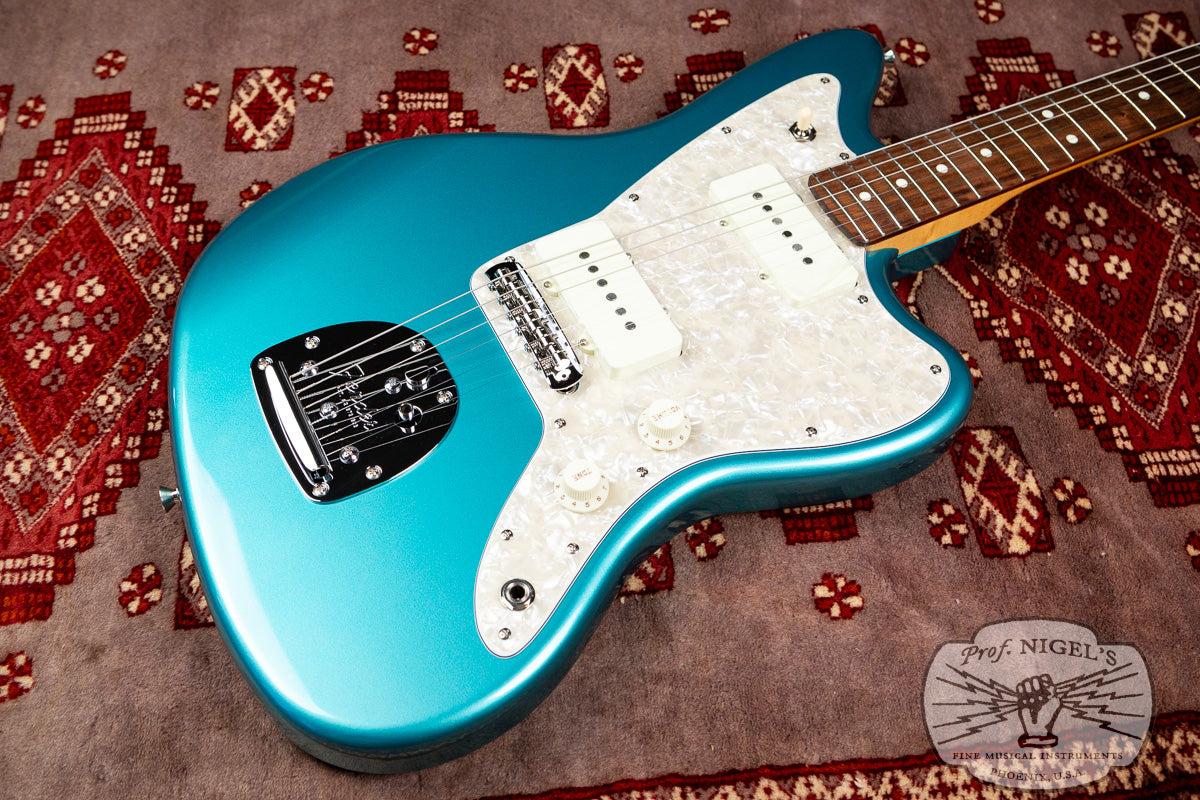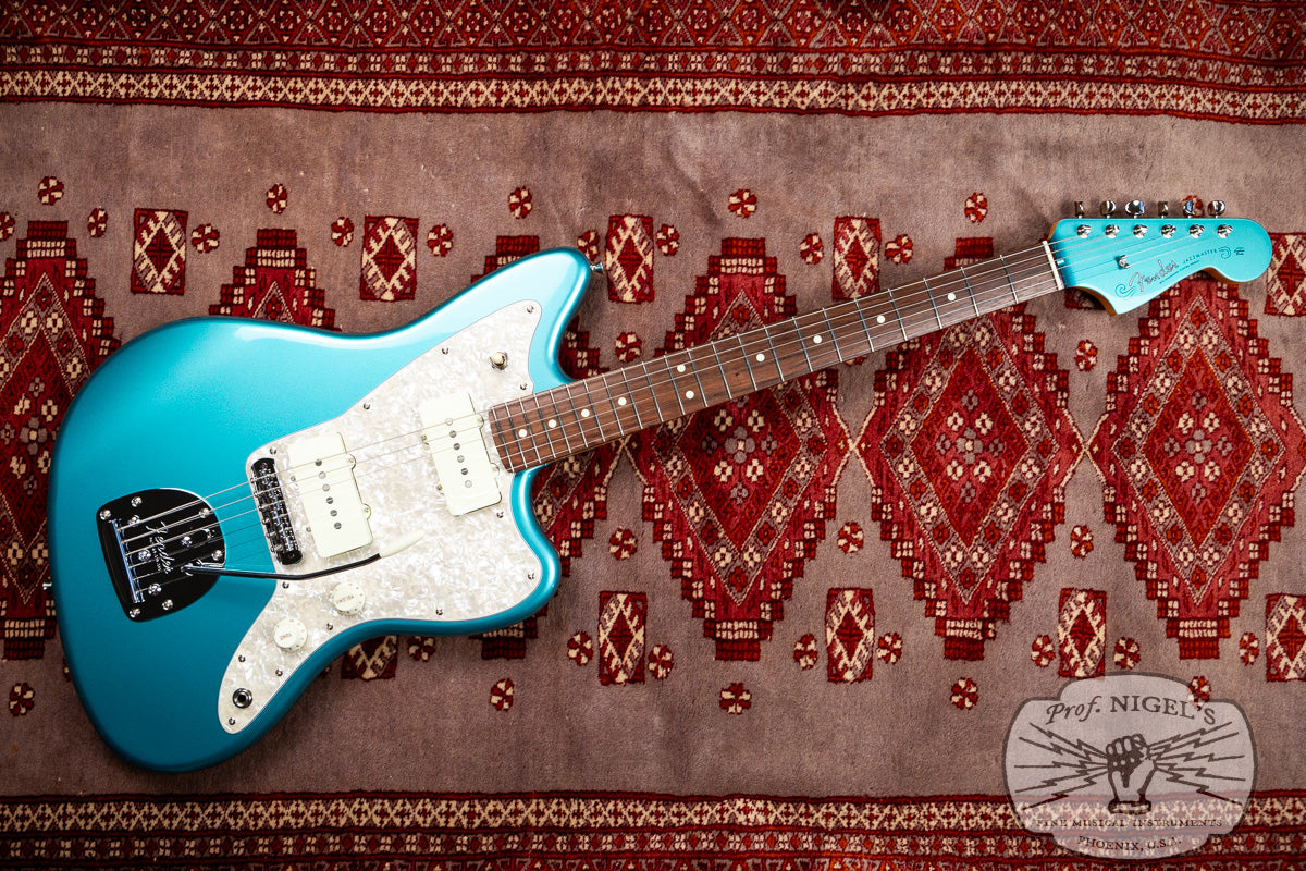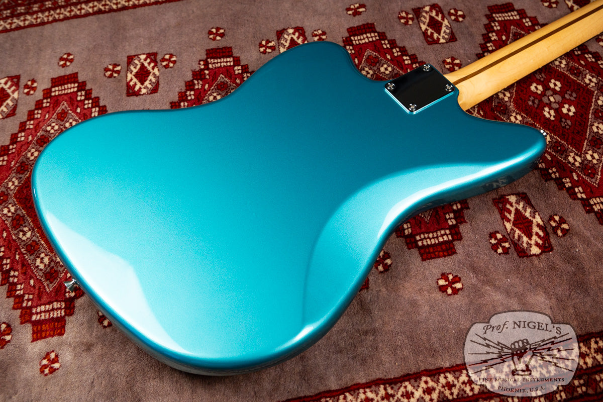 This limited run, 1 of 12, Made in Japan Jazzmaster is a rare bird indeed. This is a special run of the Hybrid II Jazzmaster for a single Japanese music retailer finished in Teal Green Metallic with matching headstock.