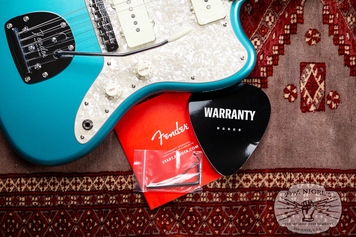 This guitar is in Mint (as new) condition and shows no signs of prior use. It was tested upon arrival to ensure everything works and that the neck is in good condition. The Fender factory gig bag, original tremolo bar, warranty card and wrench are included. This Jazzmaster weighs 7.3 pounds.