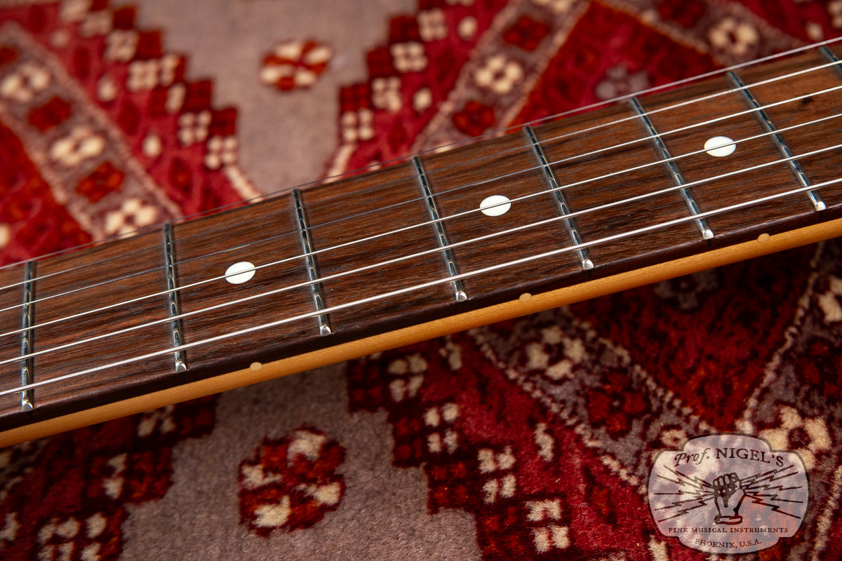 The 25.5-inch scale satin finished maple neck feels quick and comfortable to play with a 1.65-inch wide real bone nut and modern C-profile. A generous slab of gorgeously figured rosewood is used for the fretboard, which offers 22 expertly finished narrow tall frets and white dot position markers. The classic tonewood complement is rounded out with an alder body making a package that is warm and full while still offering plenty of detail, depth, and complexity. Quality hardware is used throughout with locking Kluson-style tuners.