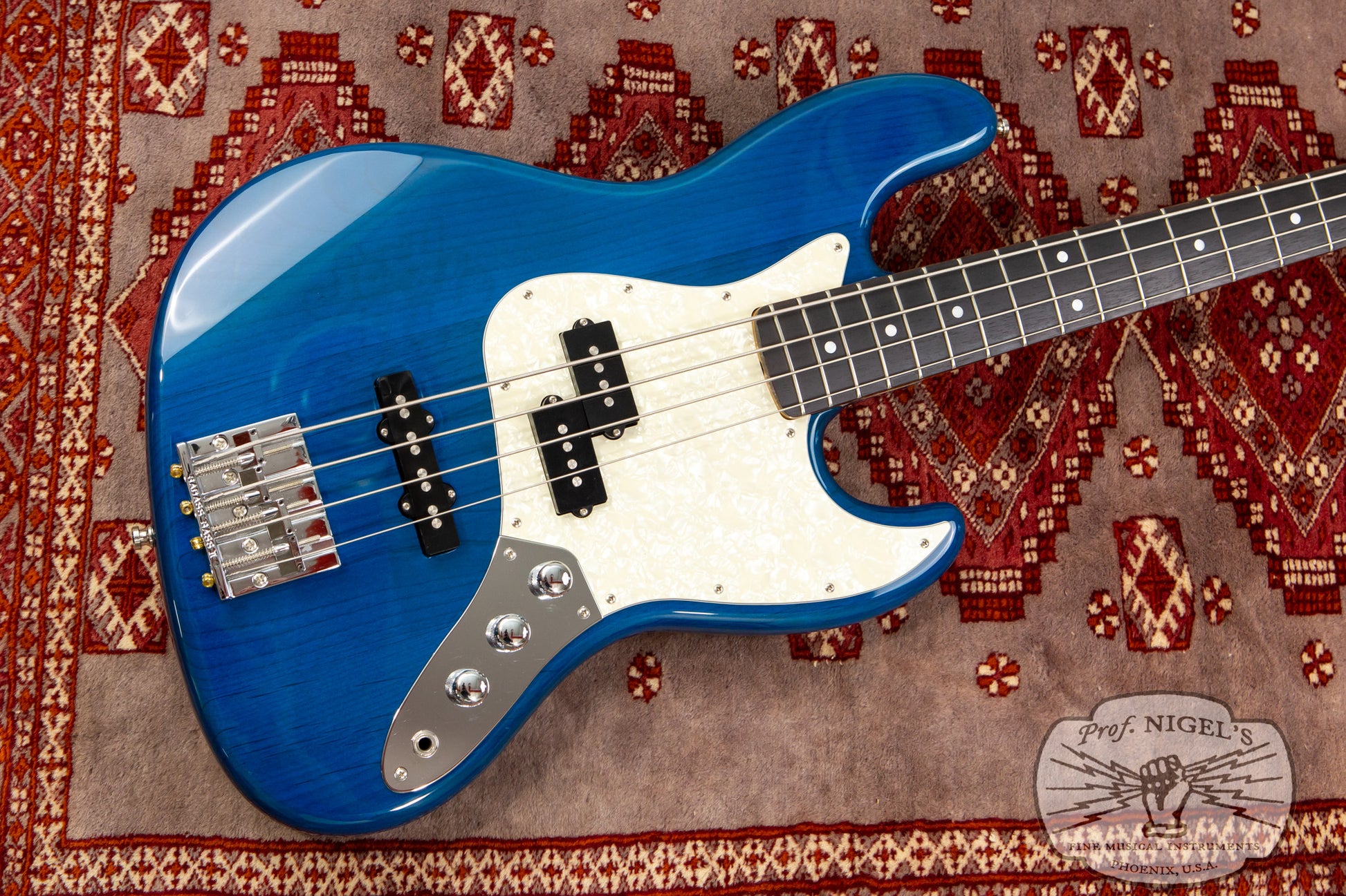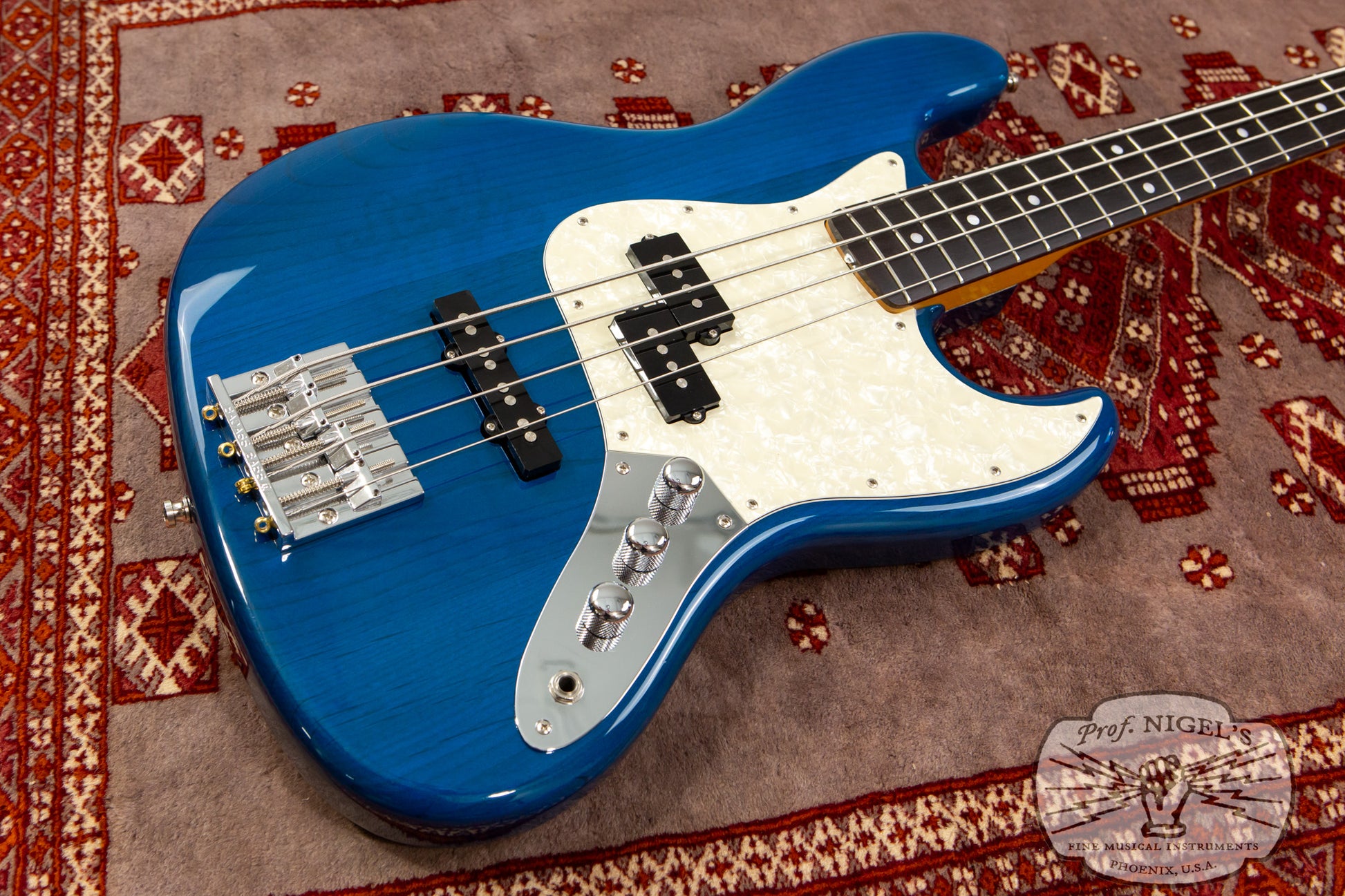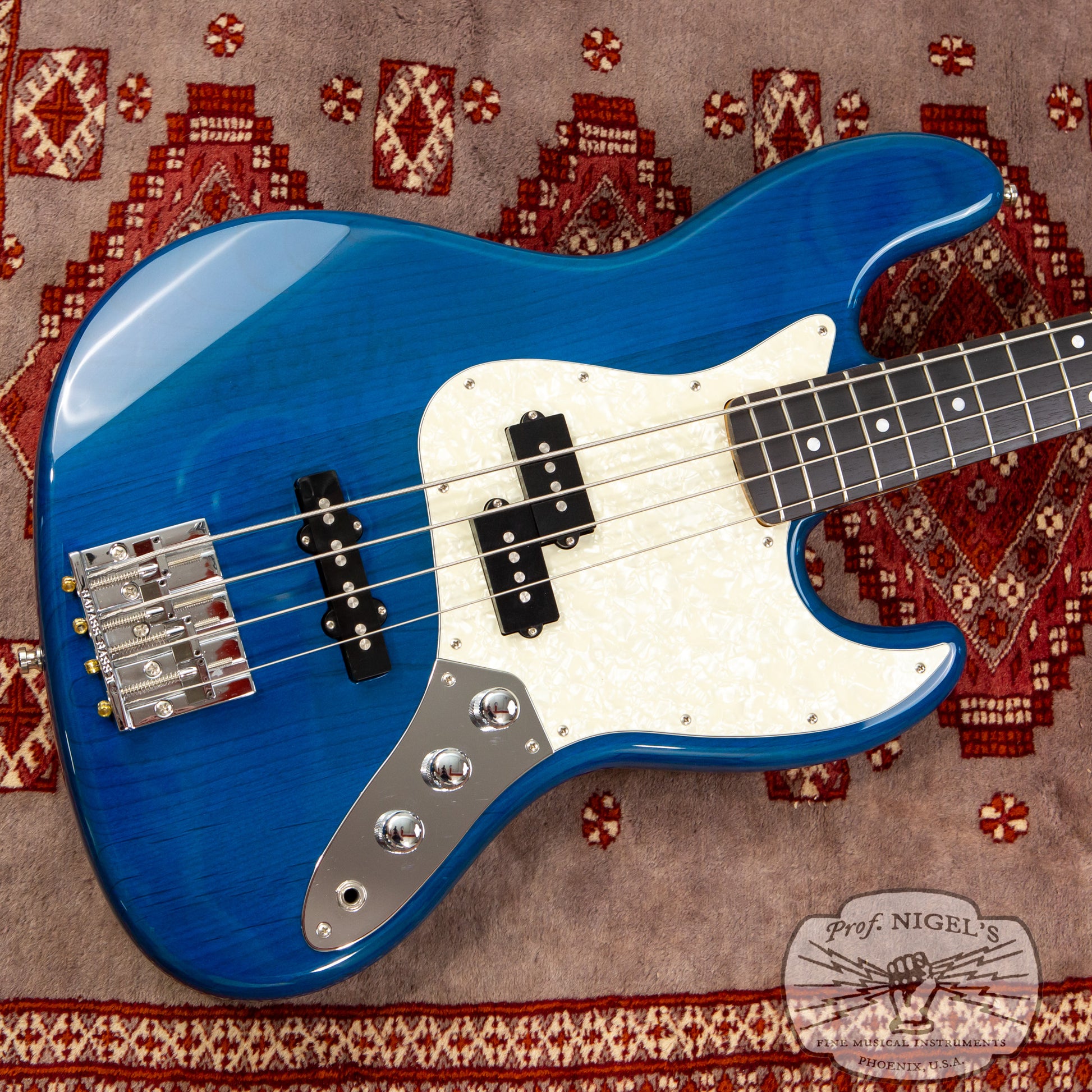 A variant of the made in Japan JB62 1962 Jazz Bass reissue, this spot order JB62-PJ features several well chosen modifications to the standard early 2010s catalog version. The beautiful Transparent Blue finish allows the natural grain and figuring of the alder body to subtly show through and is complimented by a 3-ply white pearloid pickguard. A high mass zinc alloy Badass II bridge has been selected in place of the standard vintage style spiral bridge. Standard jazz bass knobs have been swapped out for domed chrome knobs.