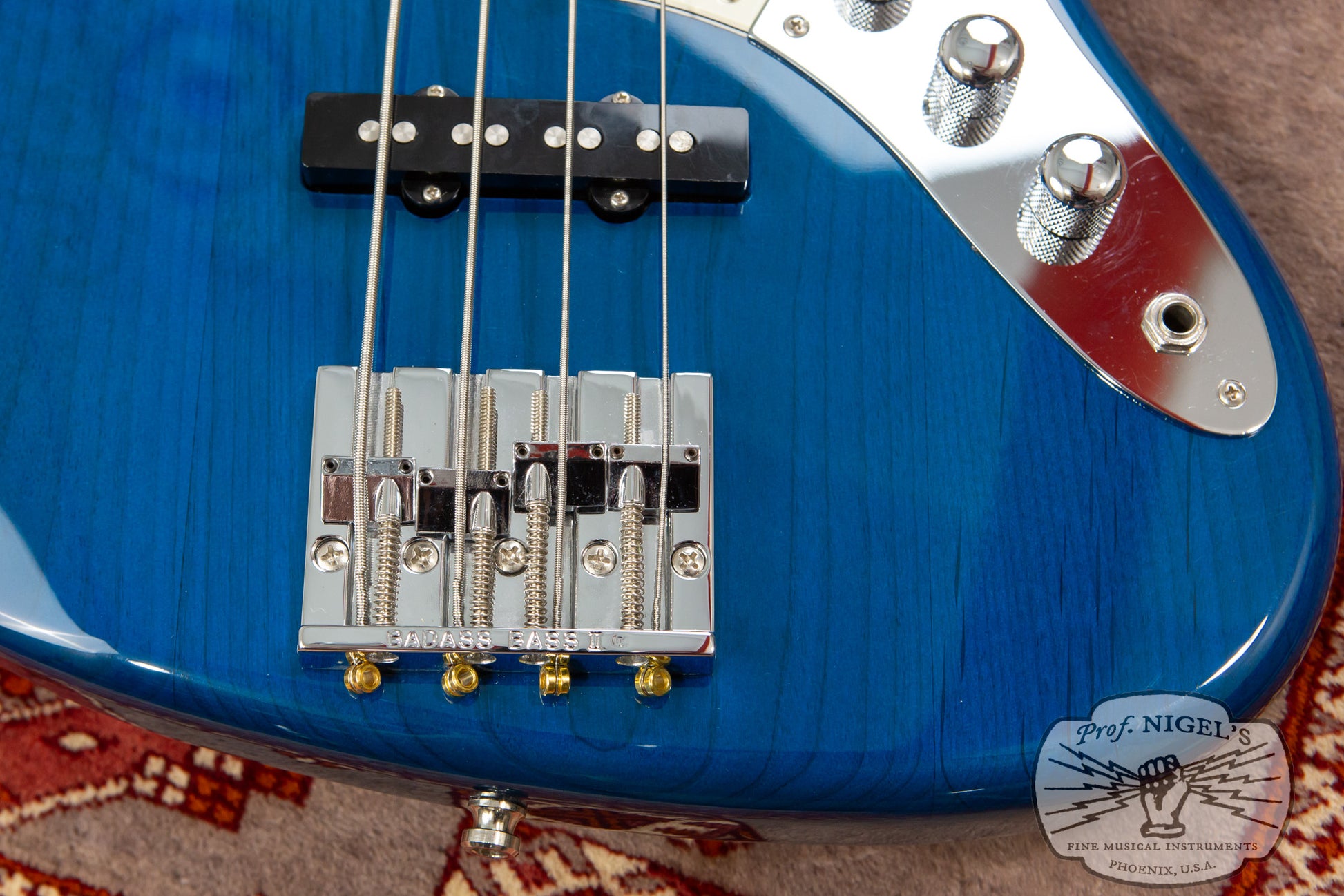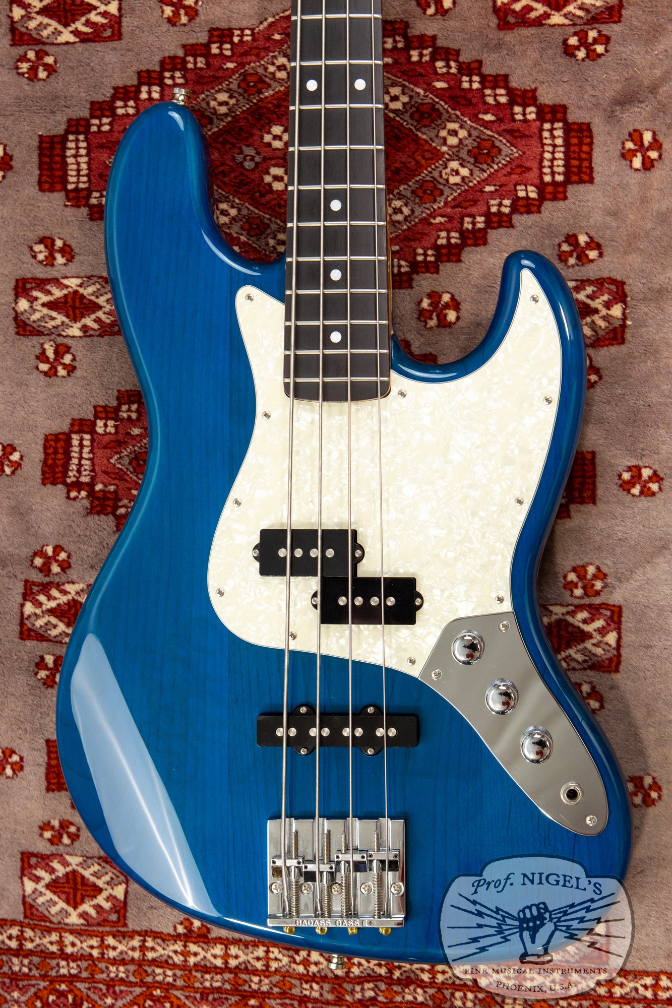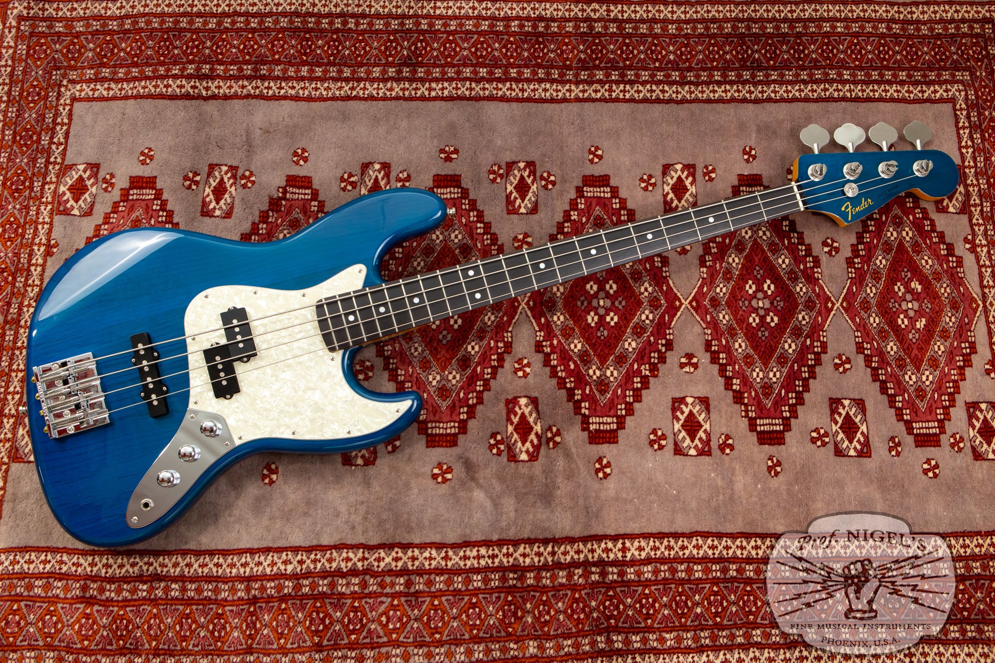 A variant of the made in Japan JB62 1962 Jazz Bass reissue, this spot order JB62-PJ features several well chosen modifications to the standard early 2010s catalog version. The beautiful Transparent Blue finish allows the natural grain and figuring of the alder body to subtly show through and is complimented by a 3-ply white pearloid pickguard. A high mass zinc alloy Badass II bridge has been selected in place of the standard vintage style spiral bridge. Standard jazz bass knobs have been swapped out for domed chrome knobs.