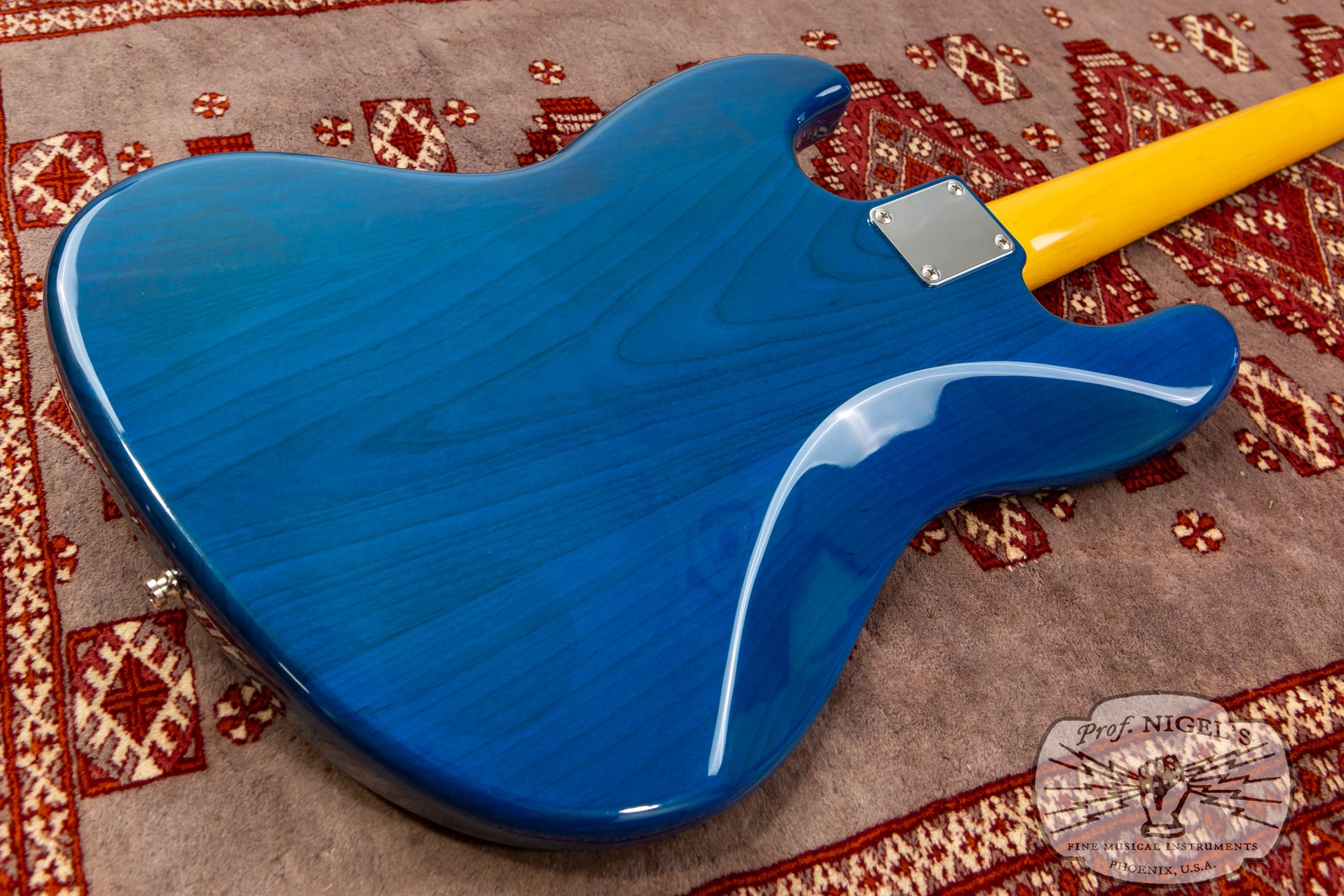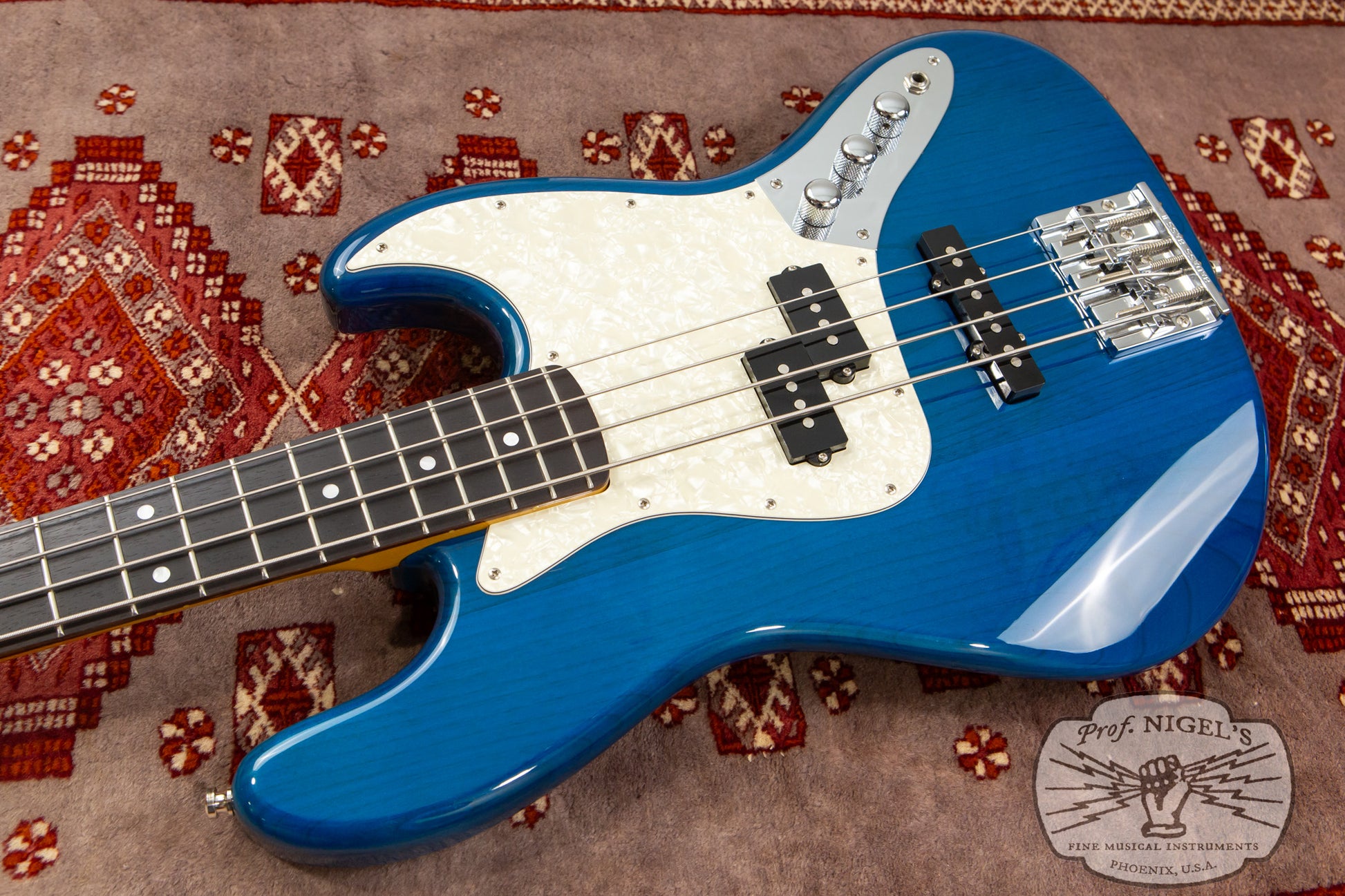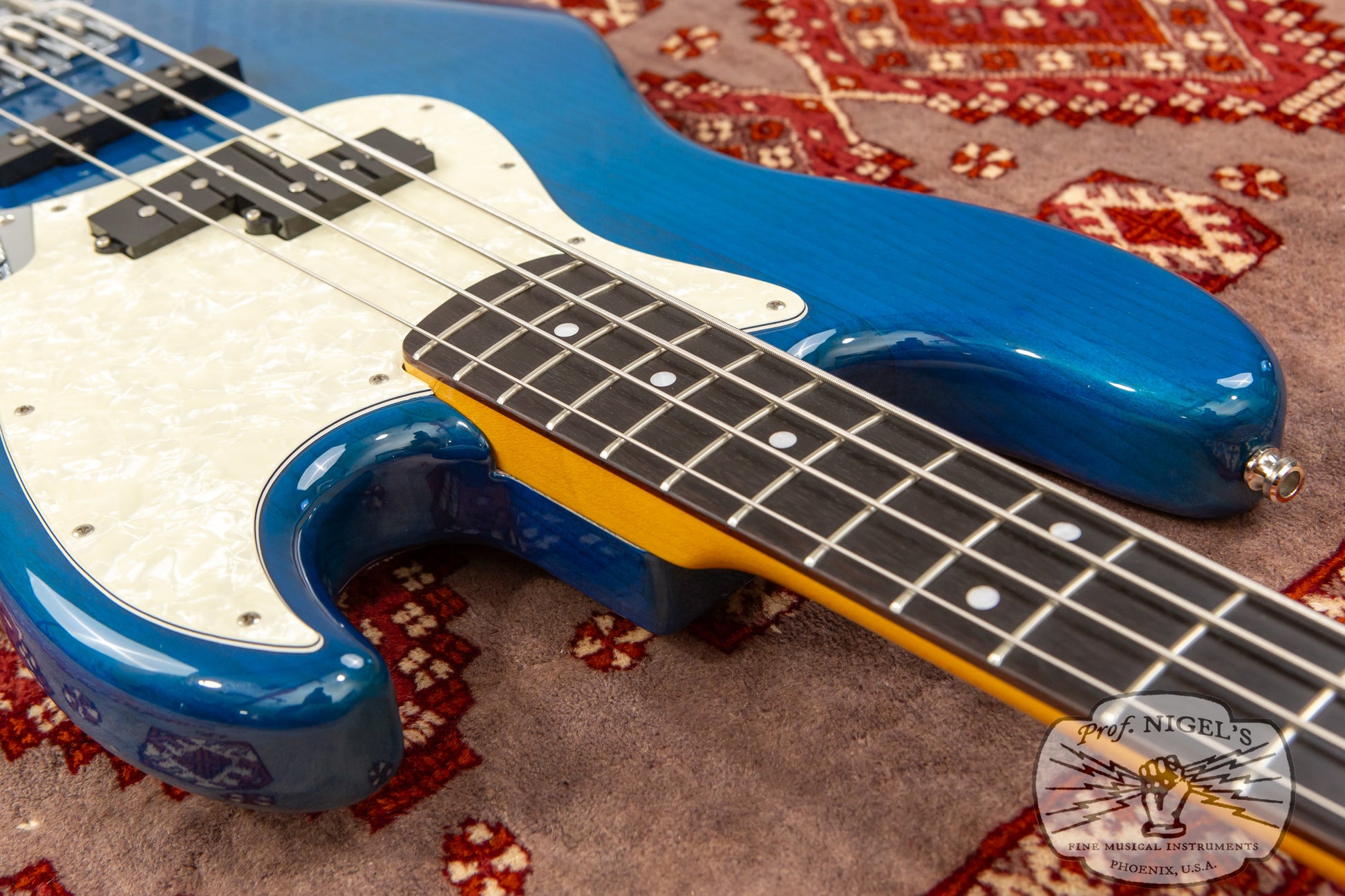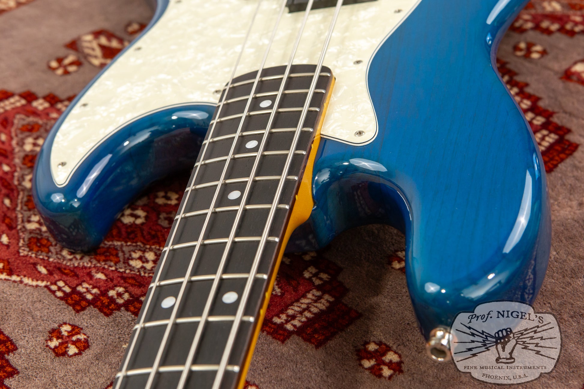 The gloss finish maple neck sports Transparent Blue matching headstock and Jazz Bass familiar 1.5-inch (38.1mm) wide real bone nut and classic U-profile. The neck profile provides a bit of shoulder while still feeling quick and comfortable (width and depth specs above). 20 expertly finished Vintage size frets and white pearloid position markers sit atop the very dark chocolate-toned thick slab rosewood fingerboard with 7.25-inch radius.