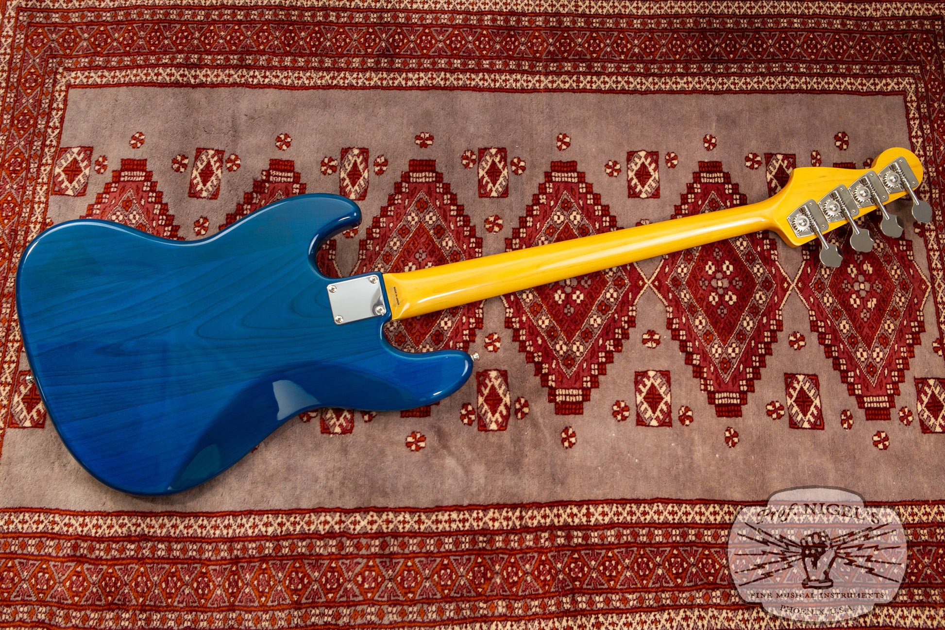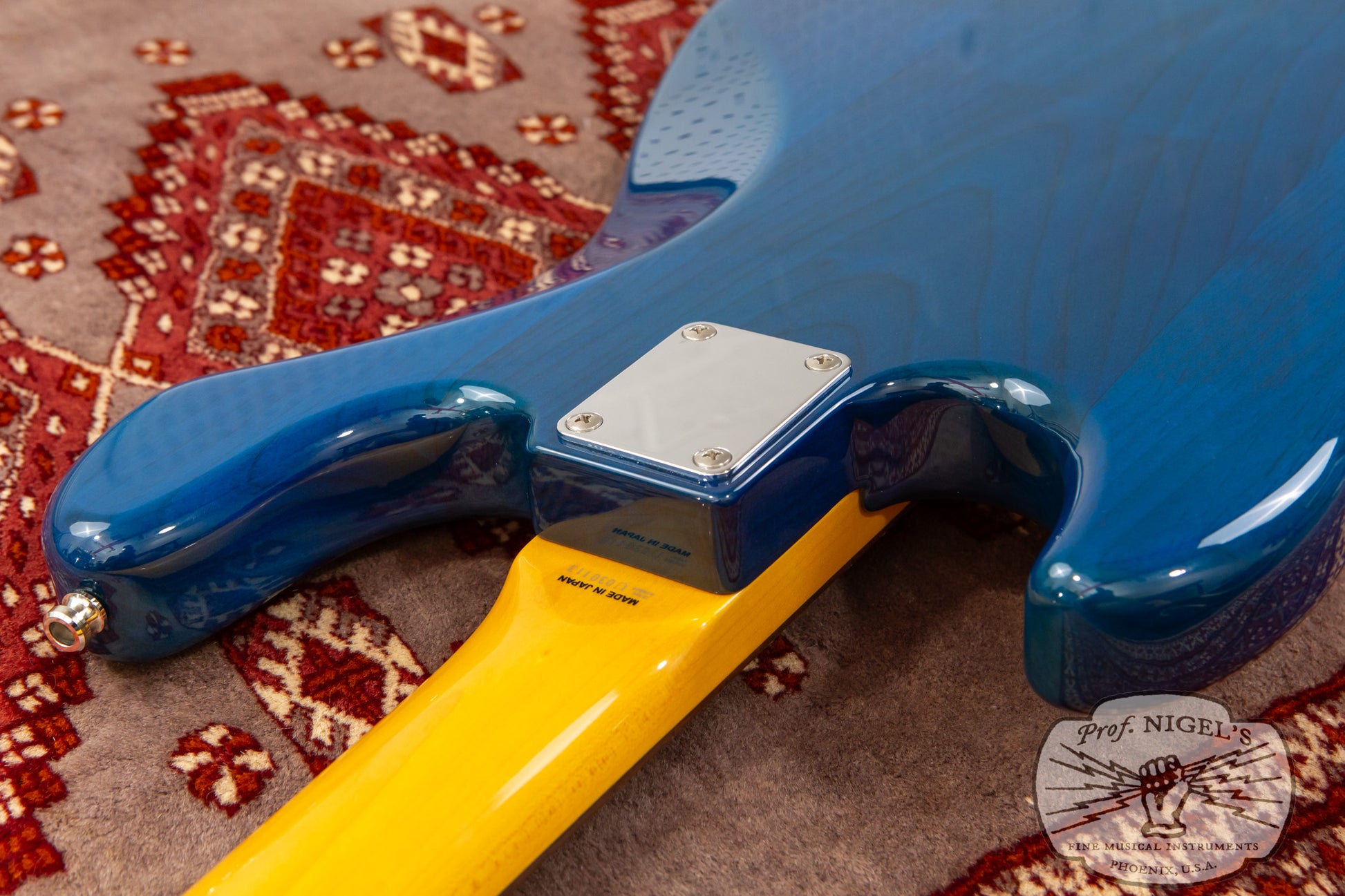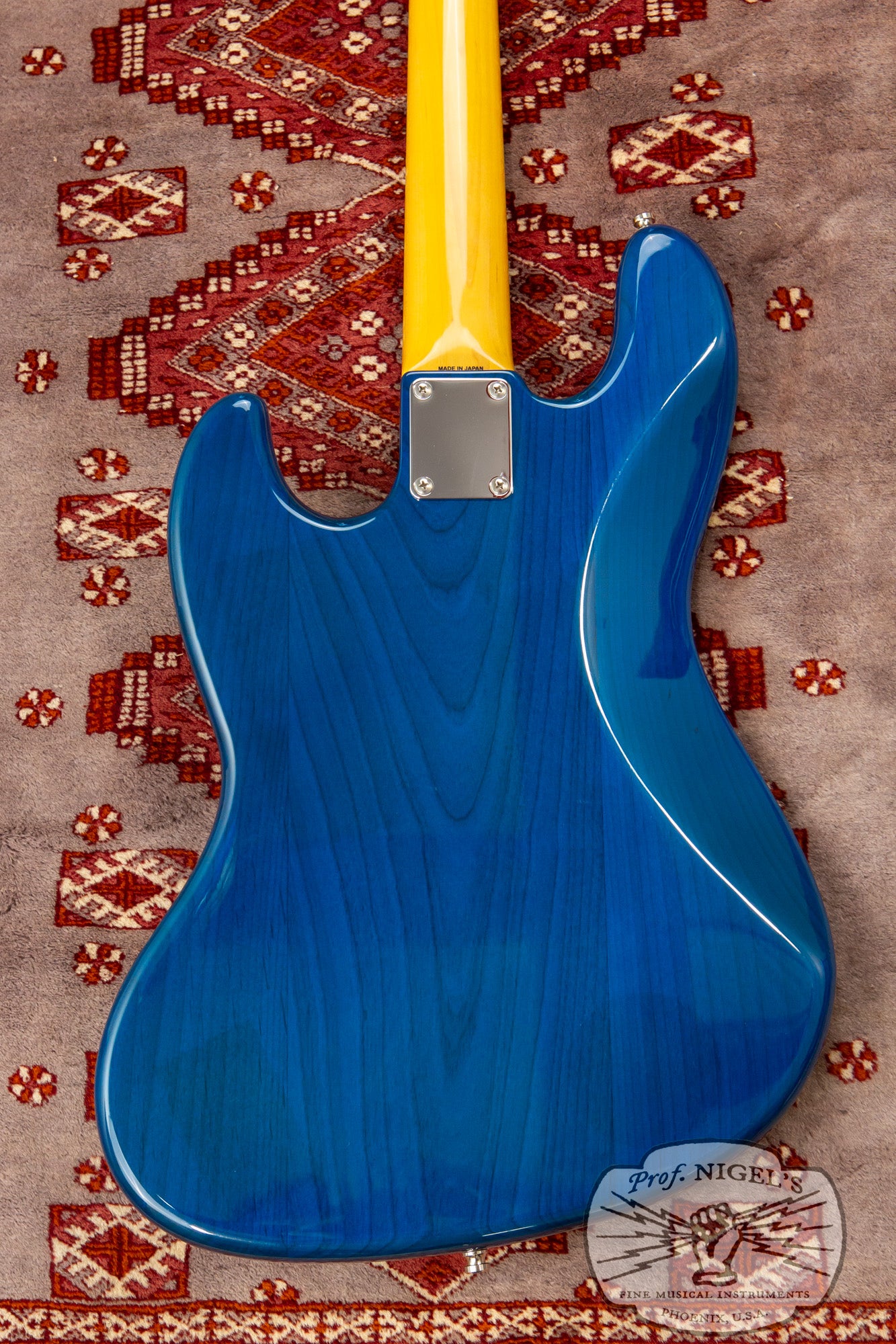 The gloss finish maple neck sports Transparent Blue matching headstock and Jazz Bass familiar 1.5-inch (38.1mm) wide real bone nut and classic U-profile. The neck profile provides a bit of shoulder while still feeling quick and comfortable (width and depth specs above). 20 expertly finished Vintage size frets and white pearloid position markers sit atop the very dark chocolate-toned thick slab rosewood fingerboard with 7.25-inch radius.