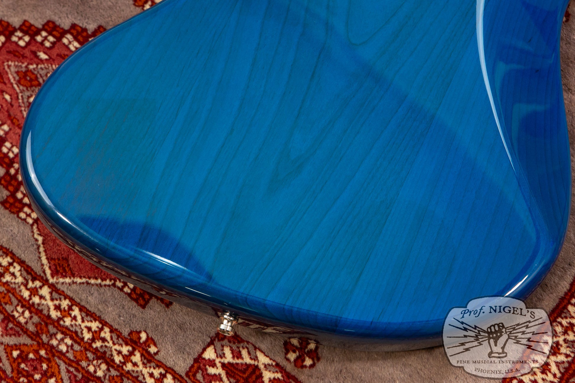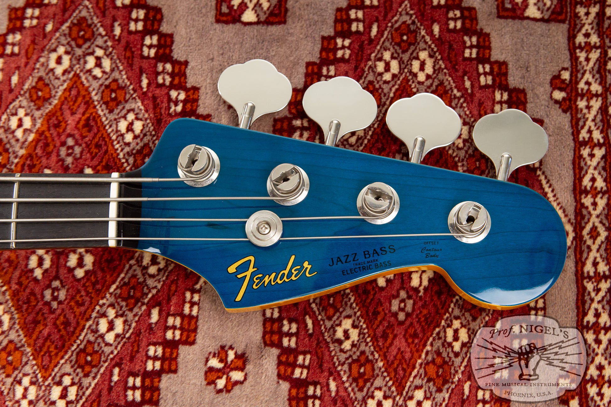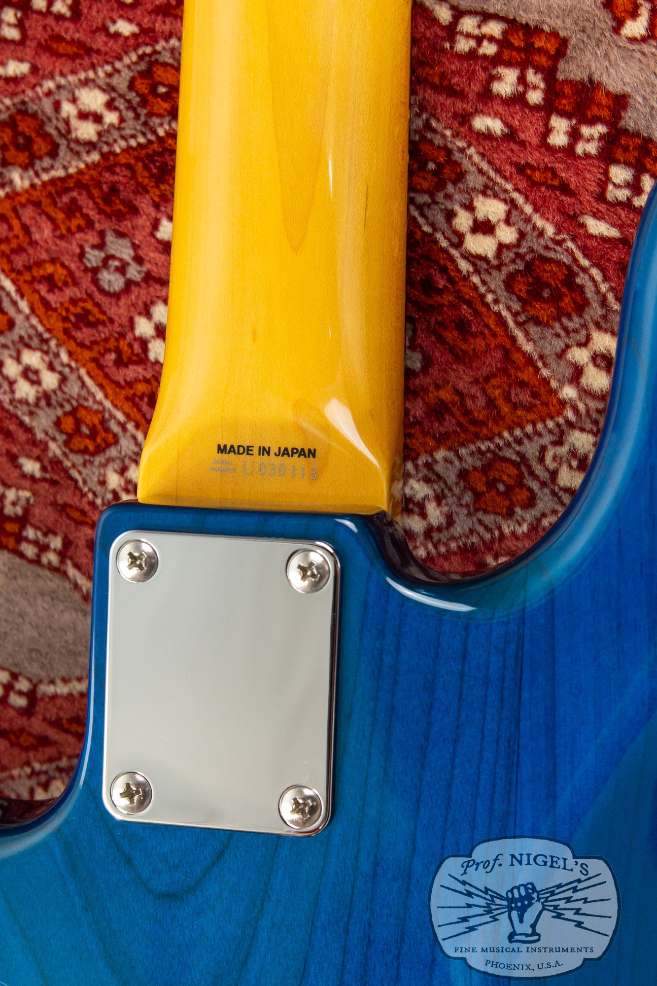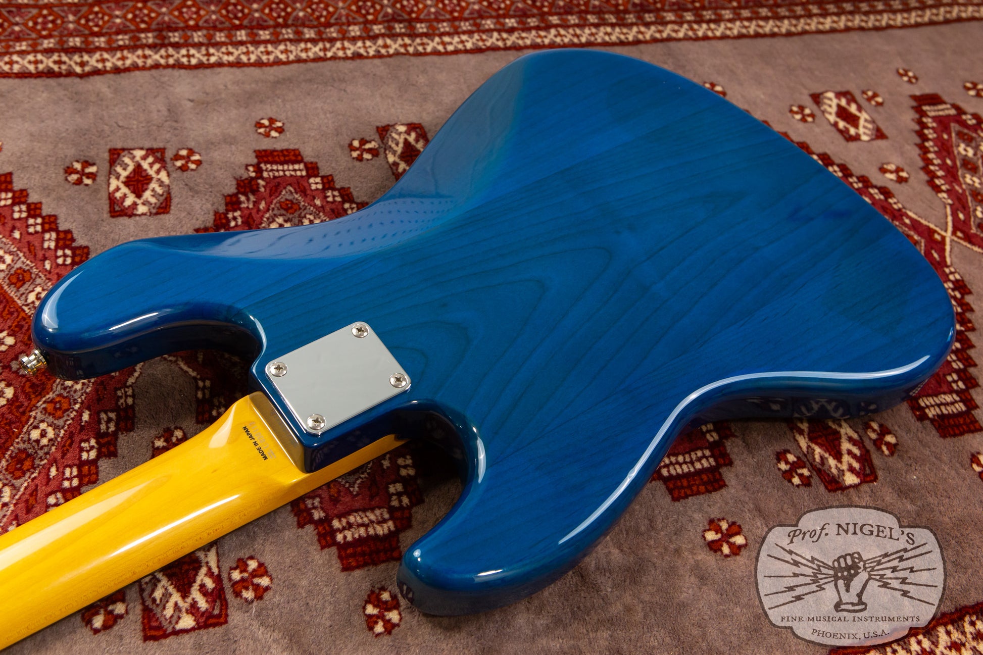 The gloss finish maple neck sports Transparent Blue matching headstock and Jazz Bass familiar 1.5-inch (38.1mm) wide real bone nut and classic U-profile. The neck profile provides a bit of shoulder while still feeling quick and comfortable (width and depth specs above). 20 expertly finished Vintage size frets and white pearloid position markers sit atop the very dark chocolate-toned thick slab rosewood fingerboard with 7.25-inch radius.