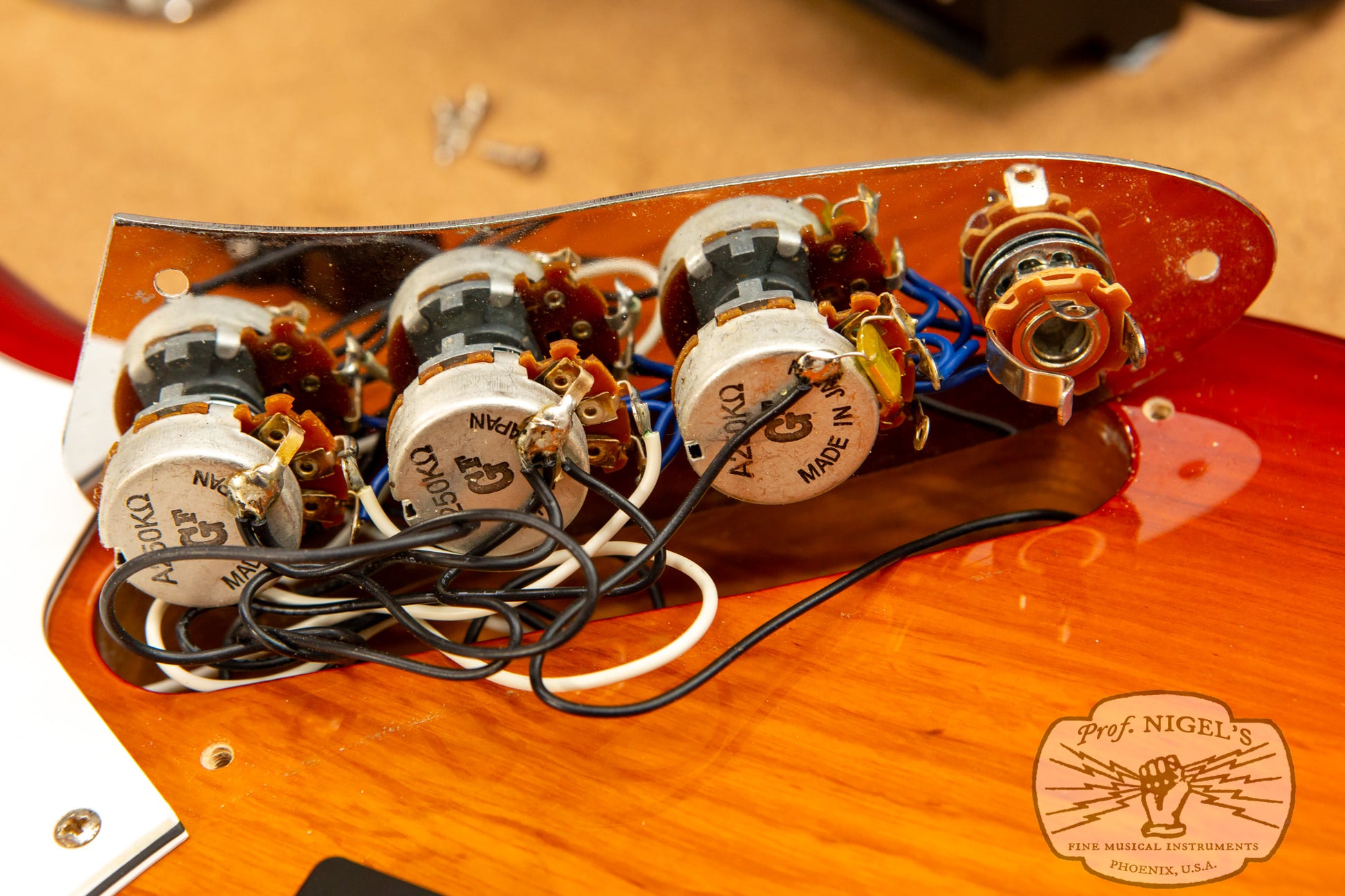 The tone from the JB75-100US is the stuff of Jazz Bass dreams, with plenty of low-end punch and midrange focus and growl for days. Thanks to the ash body, tight and focused bass is complimented by fast attack and note definition while the rosewood board slightly rounds and warms up the top end. The US-made Jazz Bass single coil Jazz pickups are the same as those used for the American Standard Jazz, offering excellent growl, spank and cut from the bridge pickup and rounder low end depth and thump from the neck pickup. Controls are traditional neck volume, bridge volume, and master tone. The high-quality original made in Japan 250k pots are paired with a 0.047µF poly film cap. No modifications are noticeable to the standard Jazz Bass wiring and everything is in great working order.