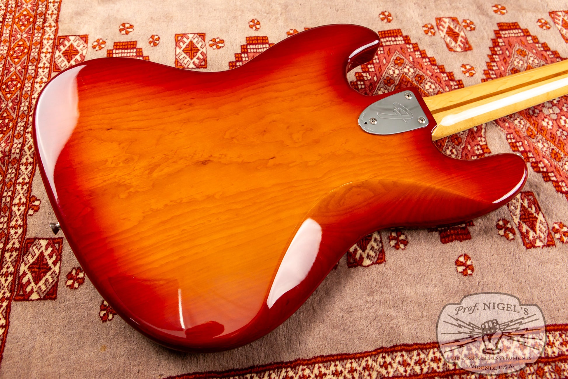 A high specification rarity produced exclusively for the Japanese market as a ’75 Jazz Bass reissue, this bass is unusual for having a premium ash body with stunning figuring, rosewood fretboard (vs maple) and Cherry Sunburst finish. It is likely this bass was made by Tokai Gakki around 2007-2008 given the serial number, stamping on the parts and construction methods.