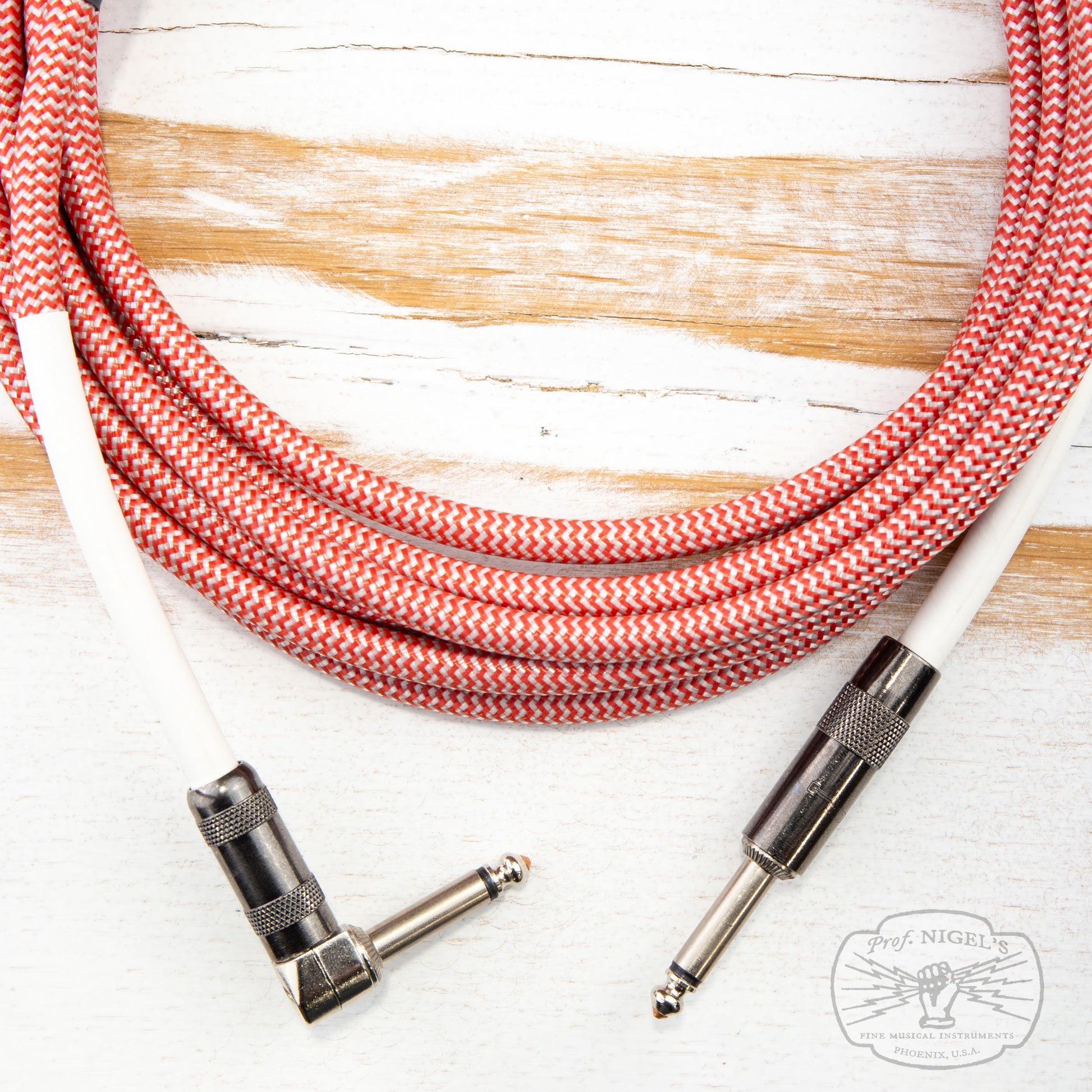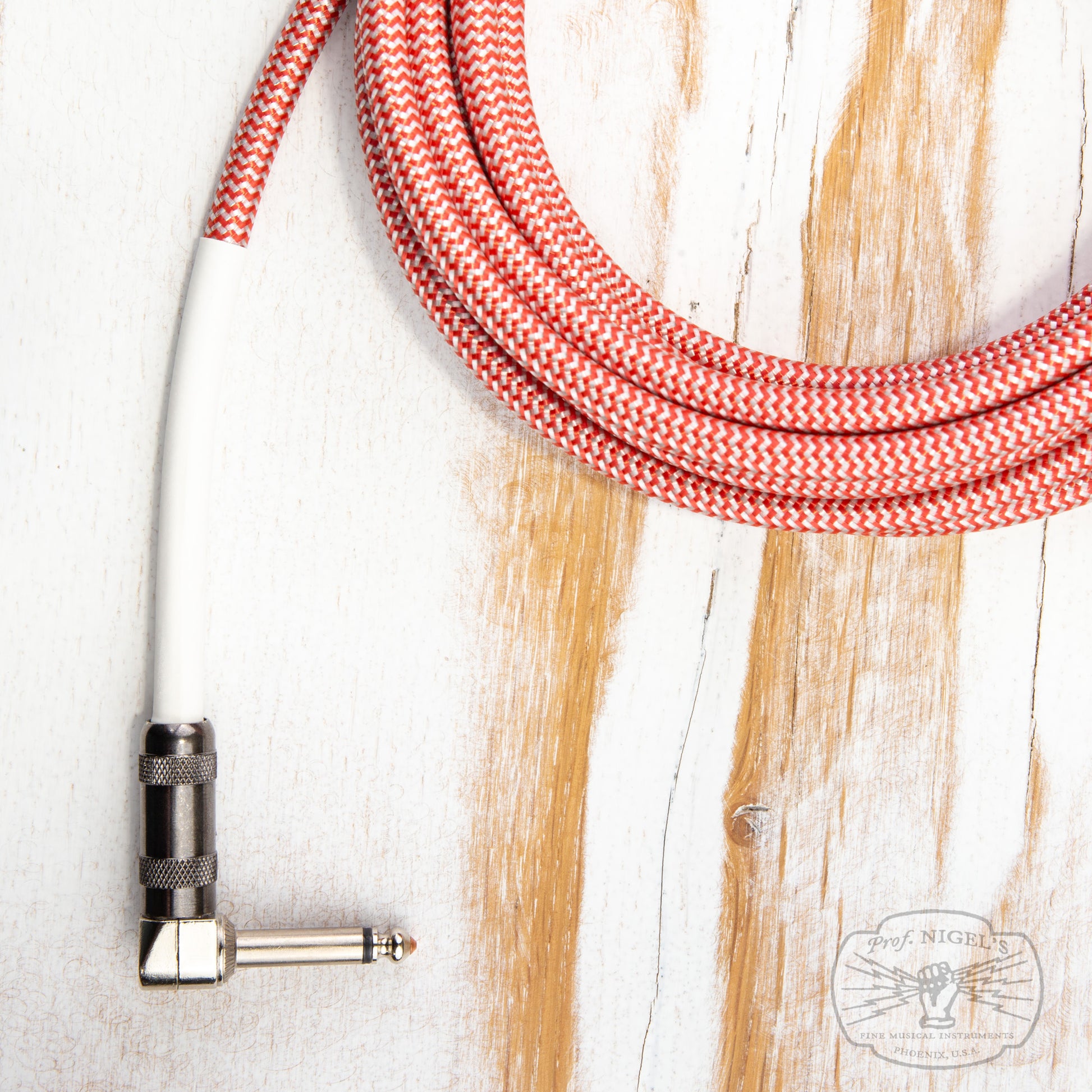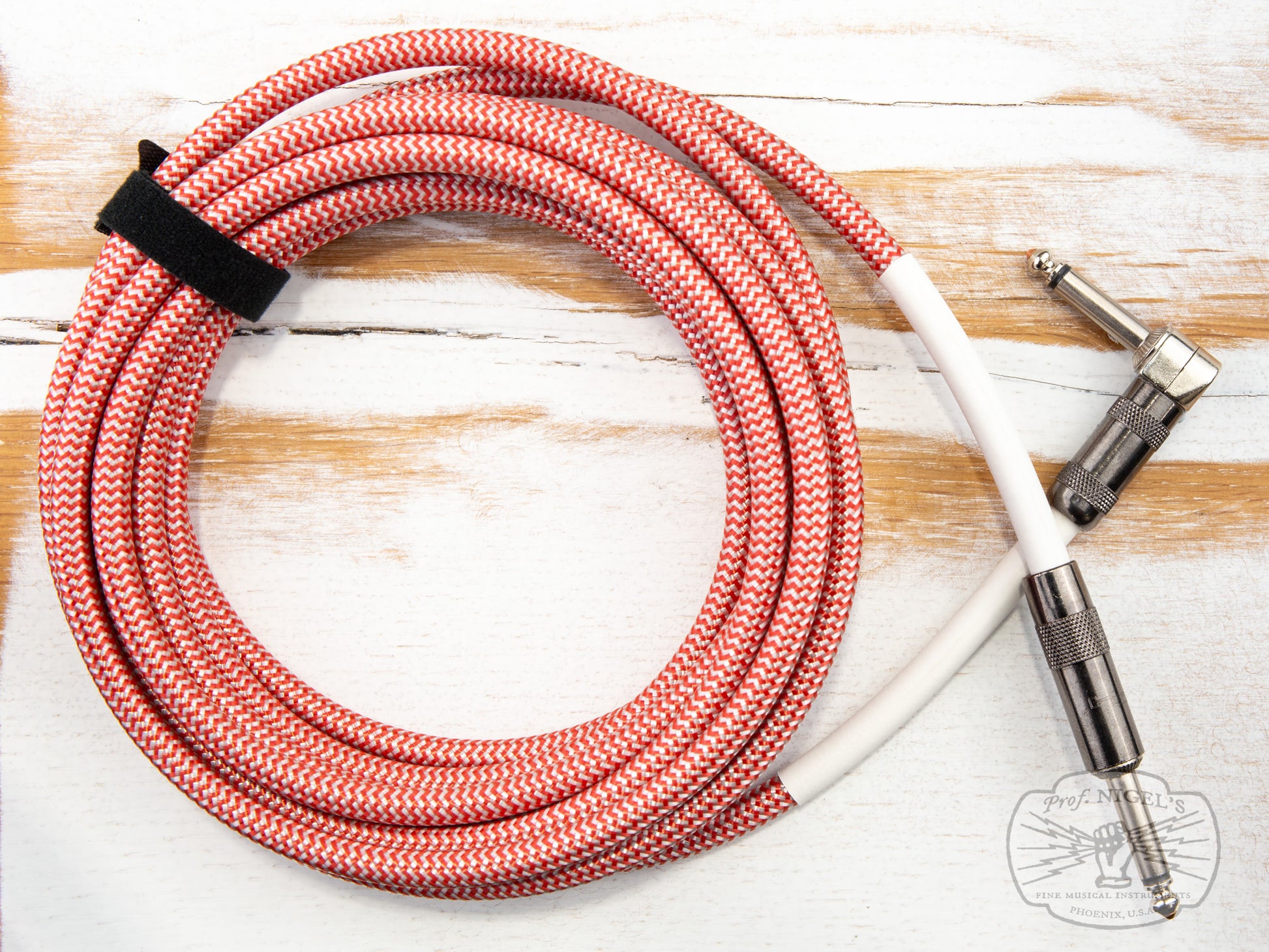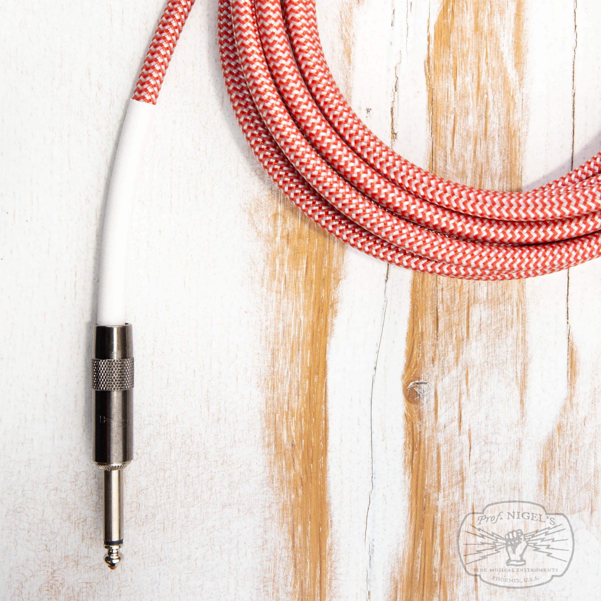Assembled by hand right here in Phoenix, Arizona, The Looking Glass is Prof. Nigel's most transparent, lowest capacitance instrument cable for guitar and bass. This version has a durable Candy Cane (red/white check) nylon braid, silver connectors with silver housing, and black strain relief sleeve that looks great and provides extra armor without damaging your guitar's finish. Made in USA components are used throughout the construction of this cable.