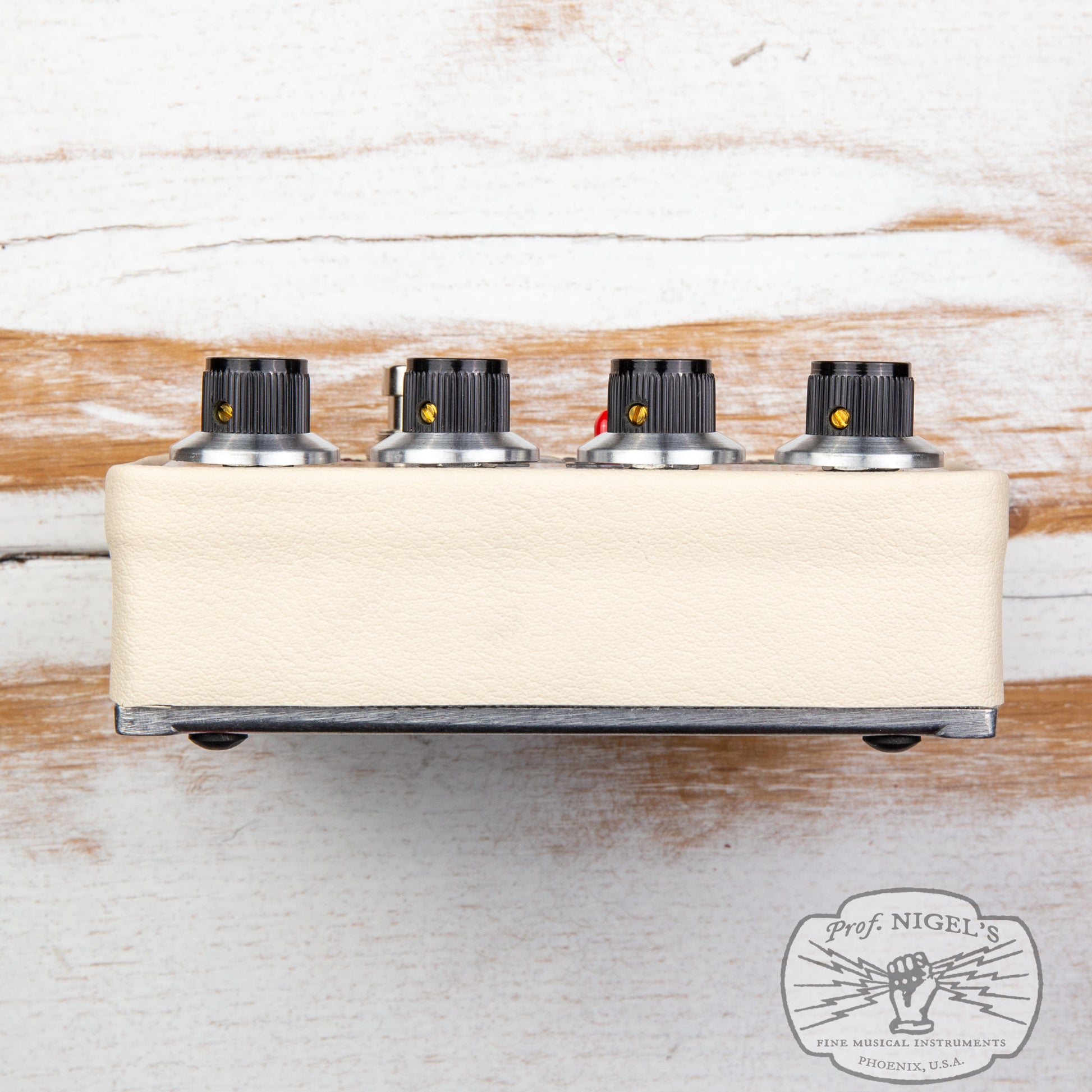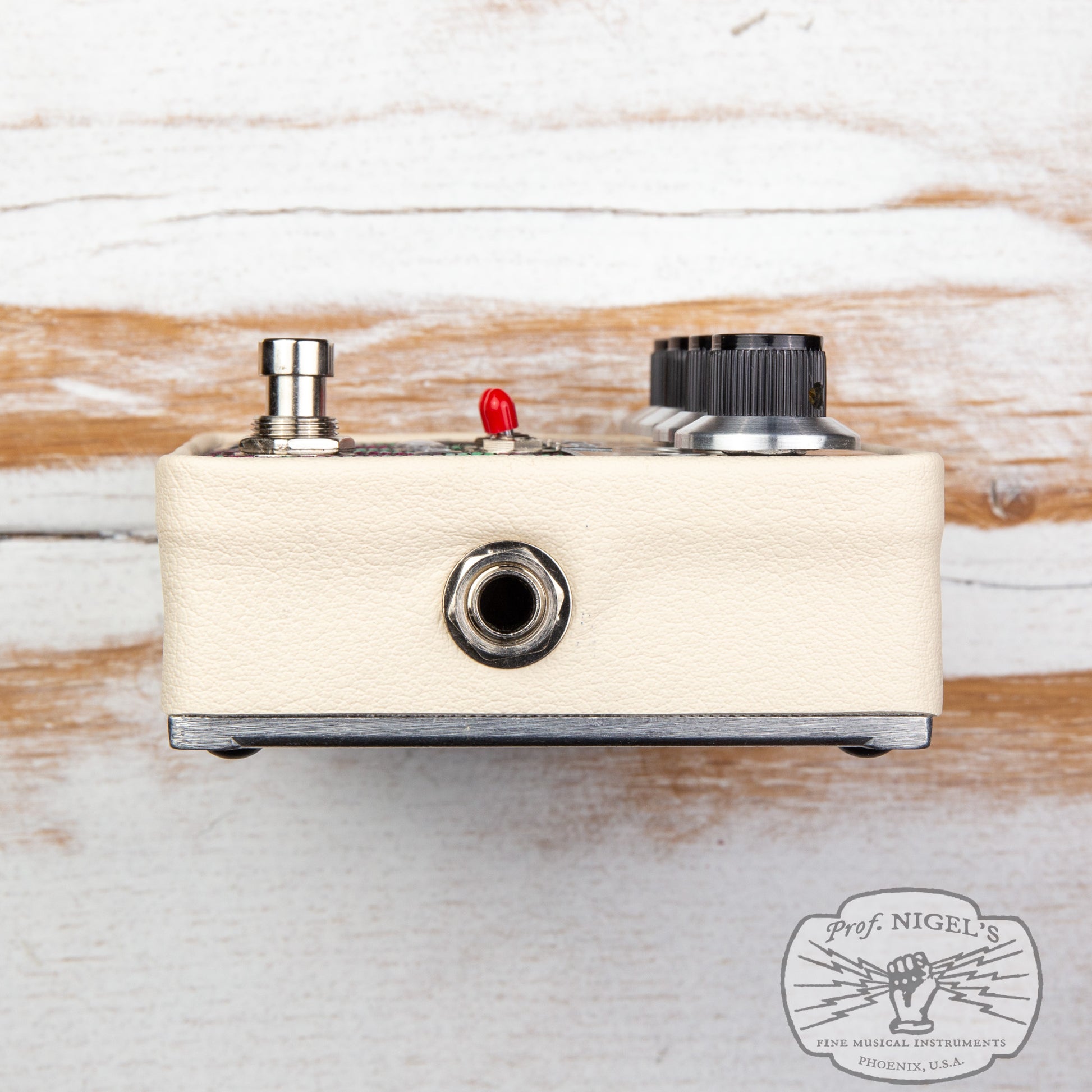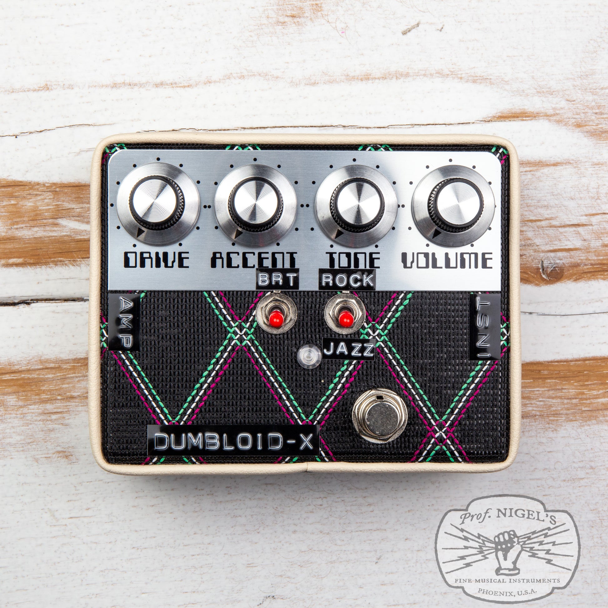 The DUMBLOID-X is part of a pair of limited edition models created by Shin’s Music in 2024 to commemorate the 10th anniversary of the DUMBLOID product and 3000 units produced. The DUMBLOID-X model is a medium gain circuit leaning toward a vintage sound with less overdrive saturation, smooth decay and controlled breakup. The design is intended to sound natural and amp-like in any music production or performance environment. Cosmetically, it invokes 60' to mid-70's amp models with silver top knobs and psychedelic silver panel, and features diamond grill fabric long awaited by DUMBLOID users.