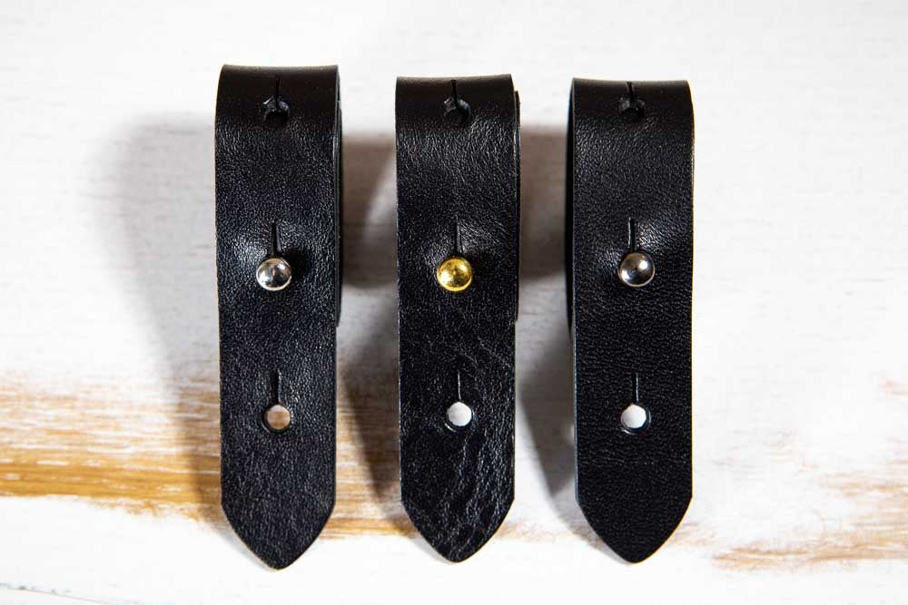 This listing is for a Leather Cable Keeper in black leather with silver, gunmetal or gold metal hardware.