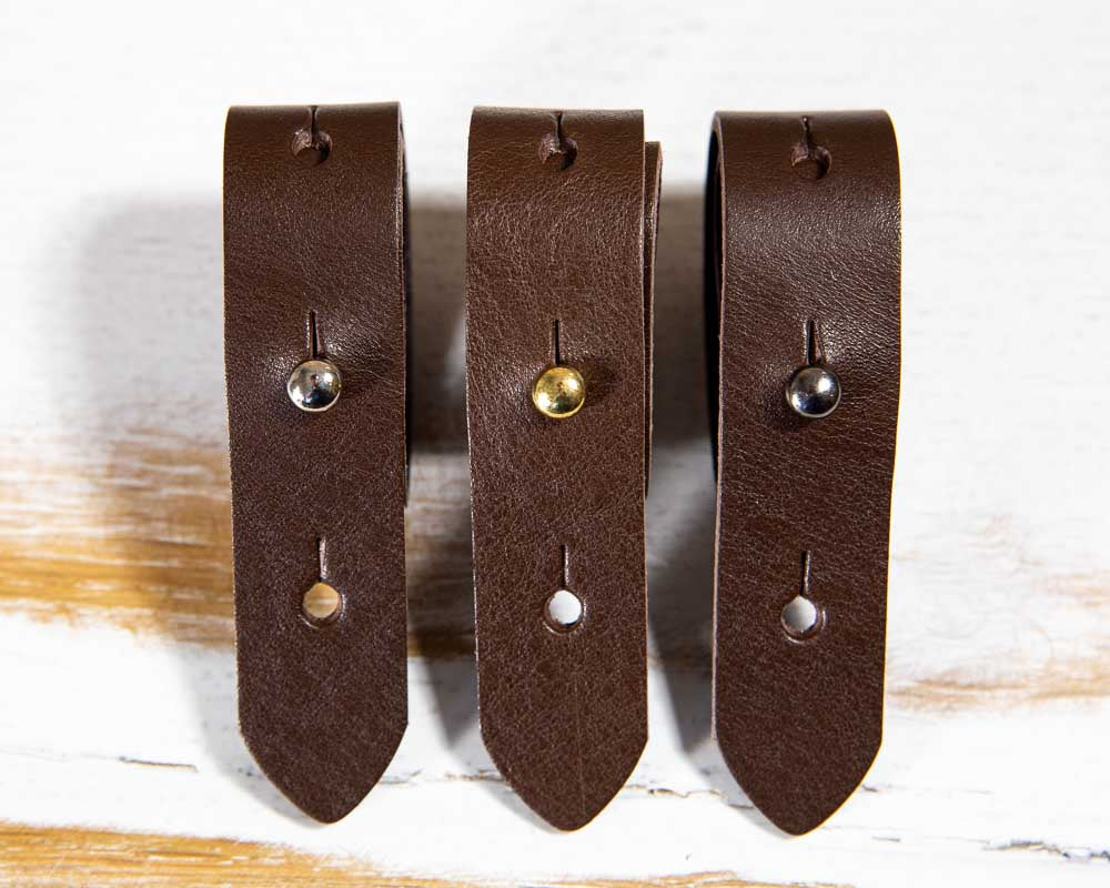 This listing is for a Leather Cable Keeper in dark brown leather with silver, gunmetal or gold metal hardware.