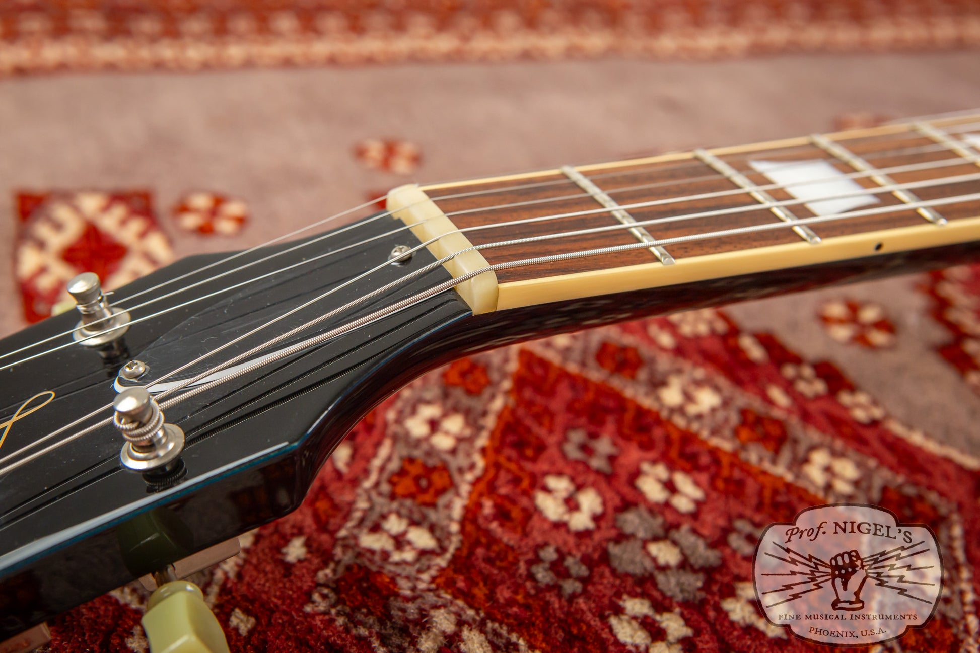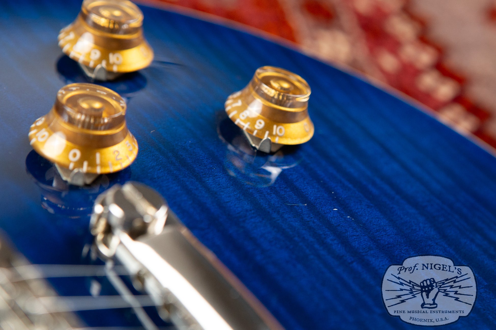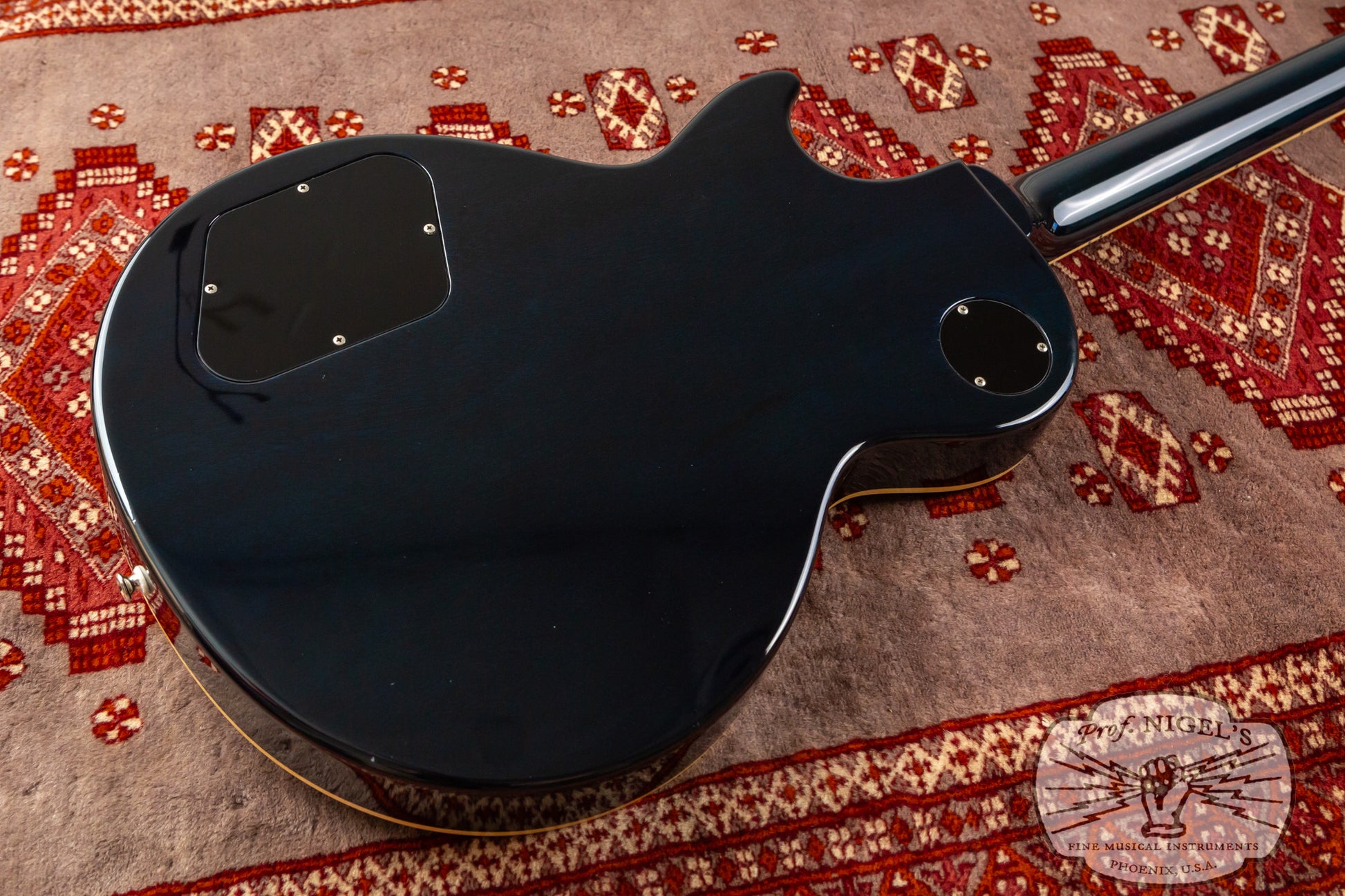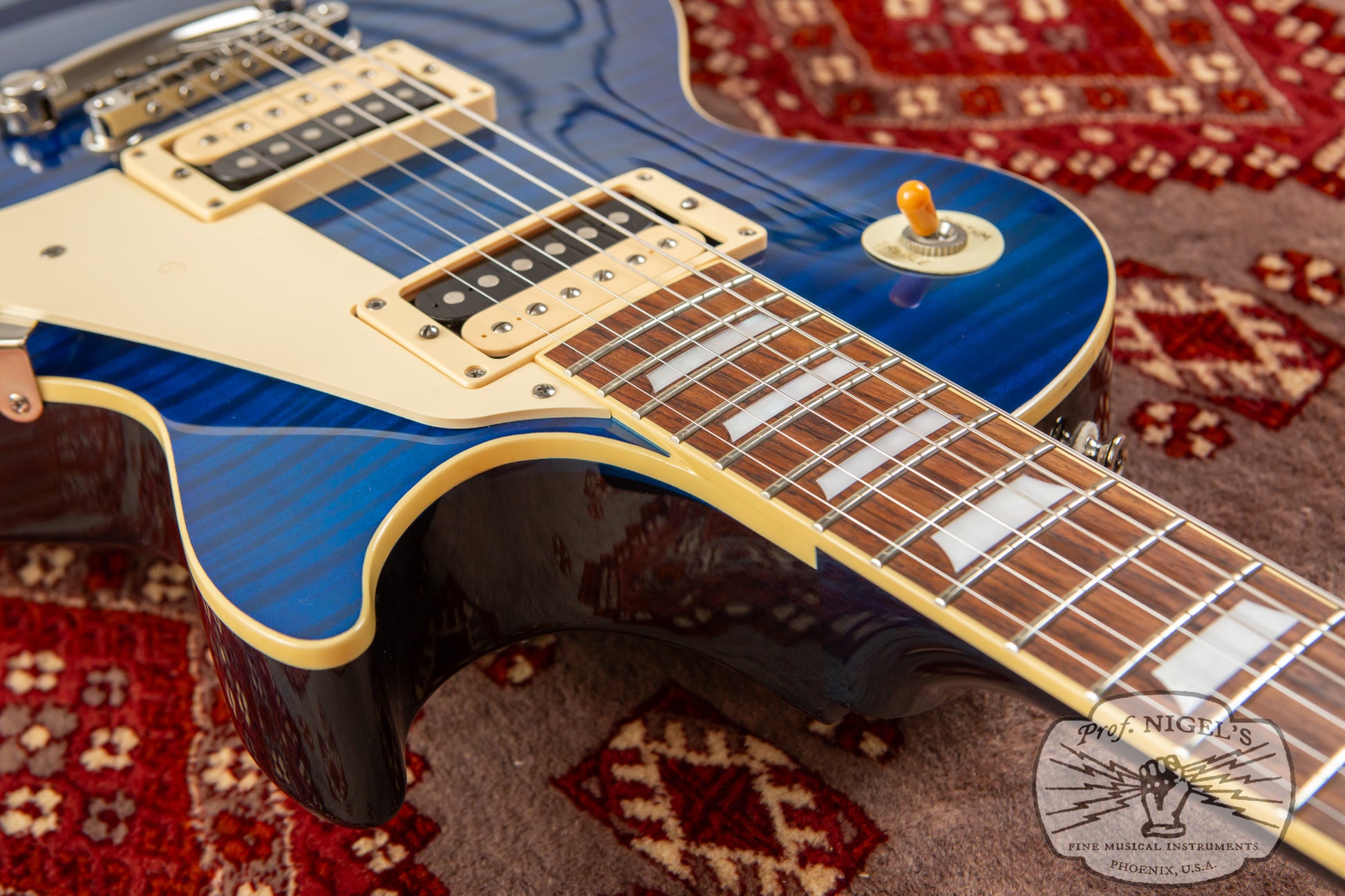 This LS128F stands out for its blend of premium build quality and vintage-correct tone at a price that still undercuts comparable big-brand models. This model features a two-piece select mahogany body with a solid maple cap with gorgeous AAAA flame maple veneer, all brought to life with a striking Indigo Blue transparent finish. The construction uses a traditional set-neck joint for optimal sustain and resonance, while the thin polyurethane finish allows the tonewoods to breathe and resonate more freely than thicker modern coatings. The mahogany body delivers warm, rounded lows and a rich midrange character, while the maple cap adds clarity, snap, and top-end definition—resulting in a harmonically balanced tonal foundation ideal for expressive lead work and dynamic rhythm playing. The 24.75-in scale mahogany neck sits comfortably in hand with a masterfully shaped hybrid 50's/60's U-profile capturing optimal characteristics from the best vintage LP neck profiles. The expertly fit vintage-style cream binding is applied around the perimeter of the body and neck, completely smooth with no gaps or notable seams. The indigo burst finish is an absolute stunner in person—dark, rich, and full of depth.
