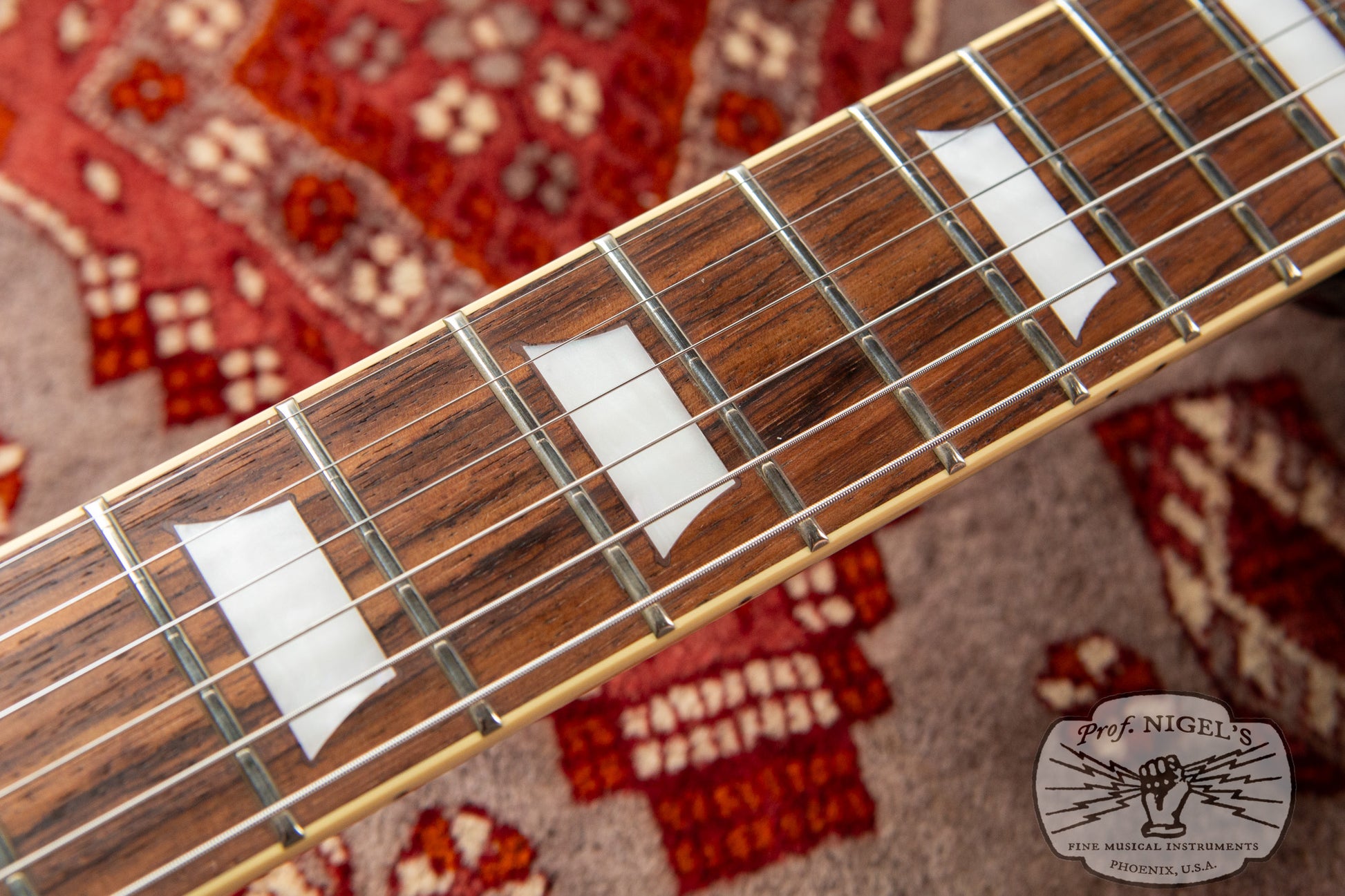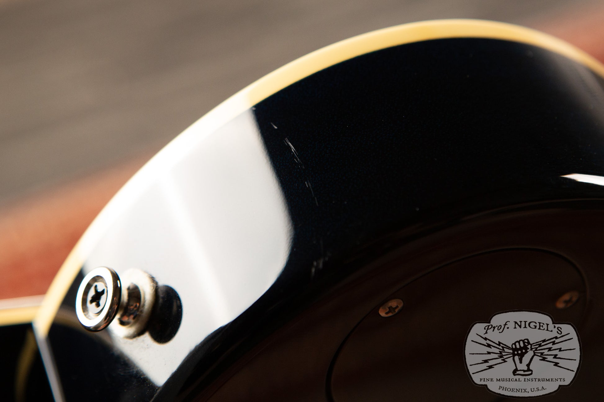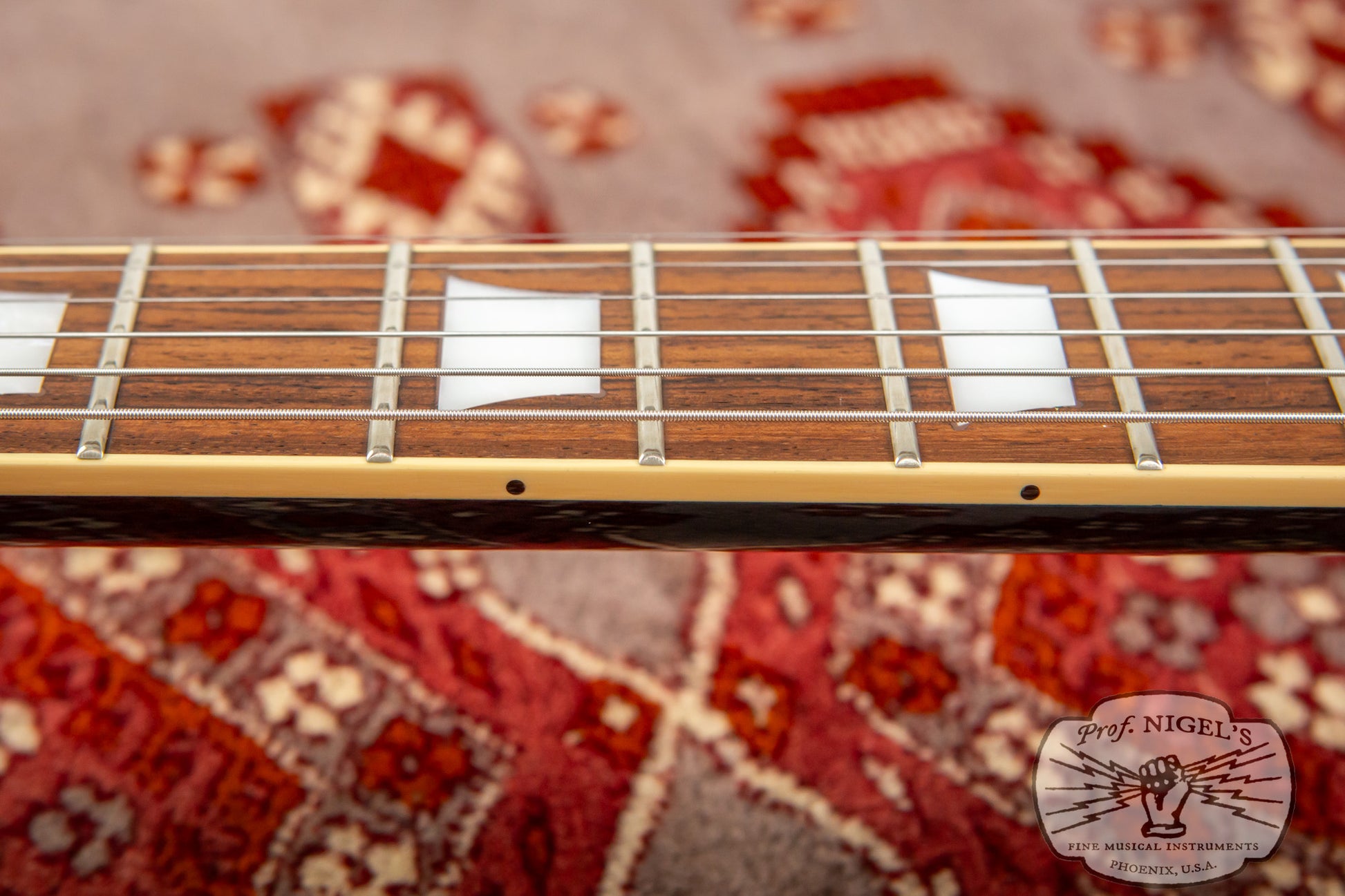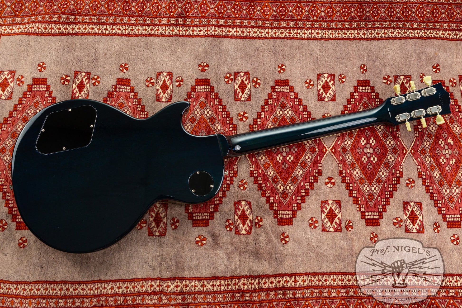 This LS128F stands out for its blend of premium build quality and vintage-correct tone at a price that still undercuts comparable big-brand models. This model features a two-piece select mahogany body with a solid maple cap with gorgeous AAAA flame maple veneer, all brought to life with a striking Indigo Blue transparent finish. The construction uses a traditional set-neck joint for optimal sustain and resonance, while the thin polyurethane finish allows the tonewoods to breathe and resonate more freely than thicker modern coatings. The mahogany body delivers warm, rounded lows and a rich midrange character, while the maple cap adds clarity, snap, and top-end definition—resulting in a harmonically balanced tonal foundation ideal for expressive lead work and dynamic rhythm playing. The 24.75-in scale mahogany neck sits comfortably in hand with a masterfully shaped hybrid 50's/60's U-profile capturing optimal characteristics from the best vintage LP neck profiles. The expertly fit vintage-style cream binding is applied around the perimeter of the body and neck, completely smooth with no gaps or notable seams. The indigo burst finish is an absolute stunner in person—dark, rich, and full of depth.